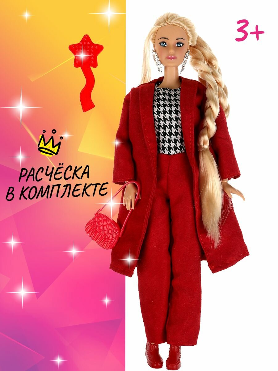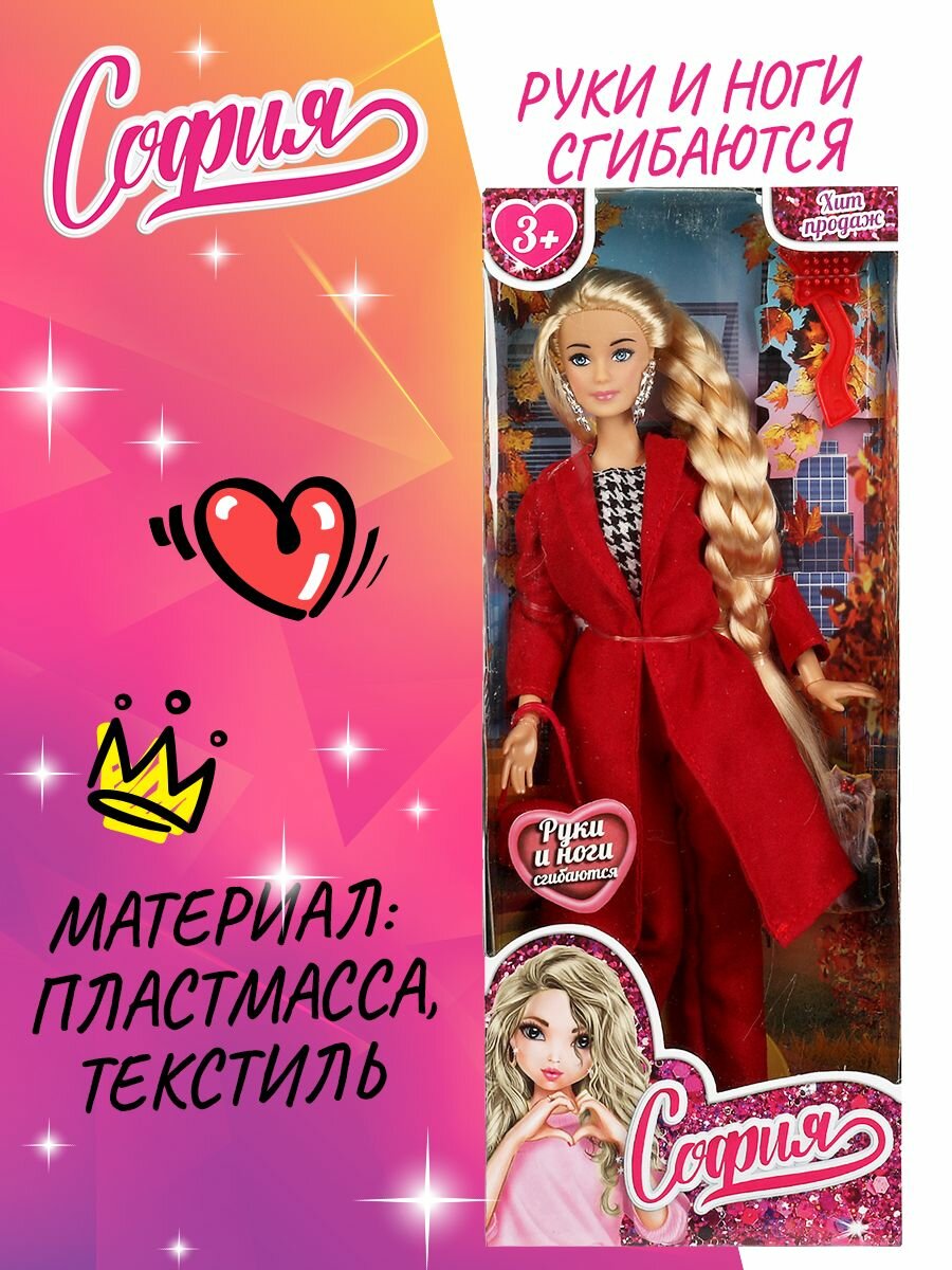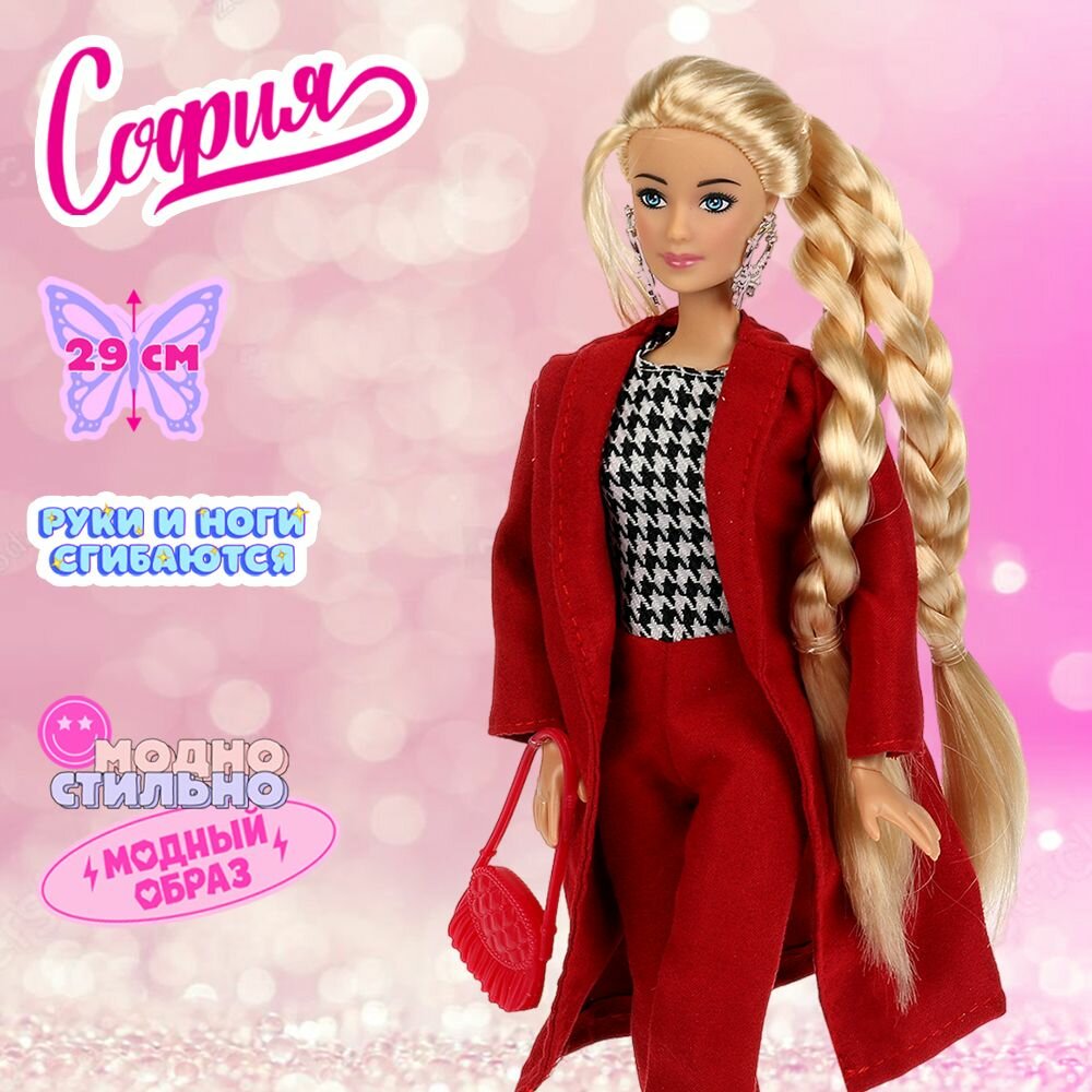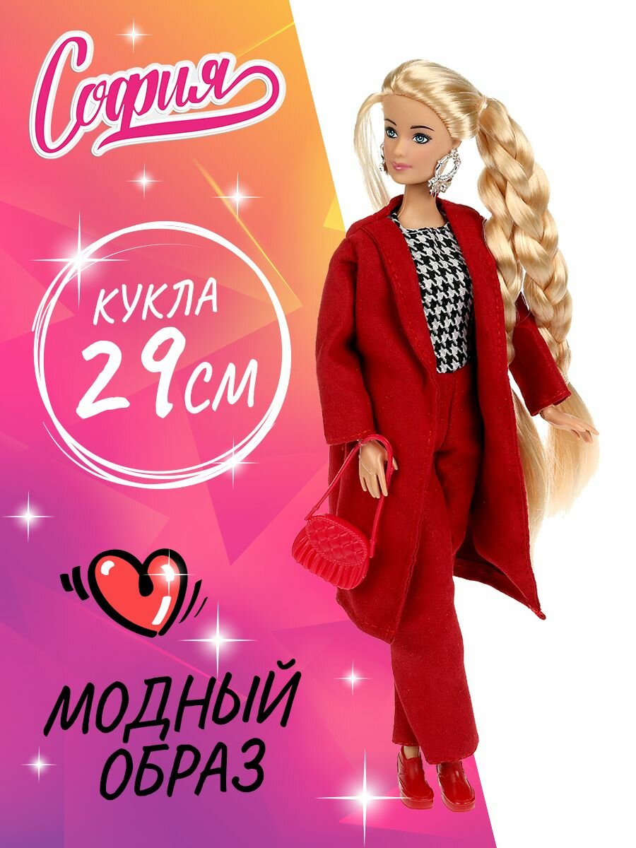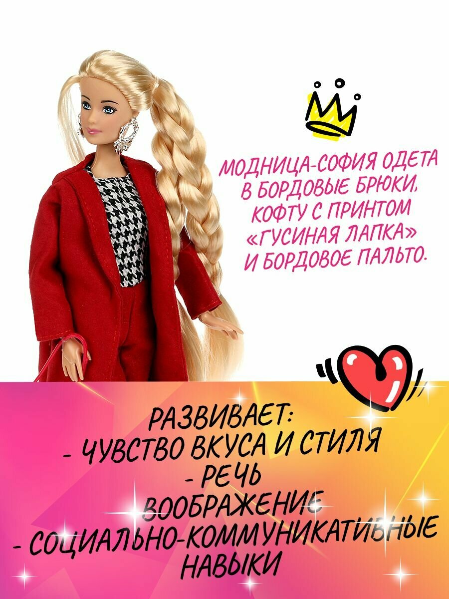 Модница-София одета в бордовые брюки, кофту с принтом «гусиная лапка» и бордовое пальто. Образ куколки дополняют стильные крупные серьги и элегантная сумочка. Одежду и аксессуары легко снять и надеть. С такой модной куклой девочке будет интересно и весело играть: благодаря тому, что руки и ноги куклы подвижны, им можно придать любое положение.