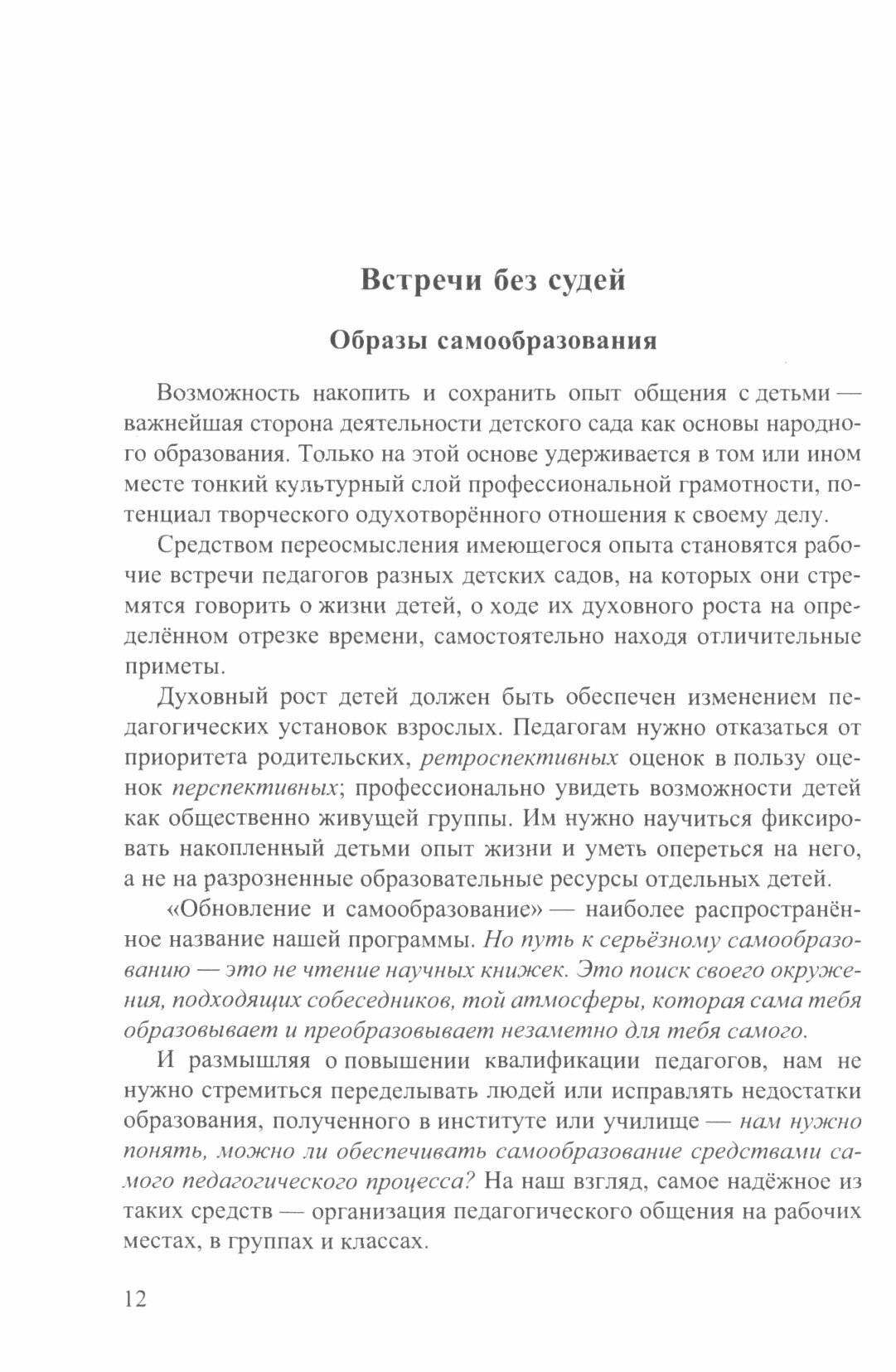 Первая часть раскрывает модель организации неформальной системы самообразования педагогов через их встречи на рабочих местах и совместные наблюдения за жизнью детей, вторая часть - общую логику планирования дошкольных занятий через проектирование событий детской жизни; при этом предполагается, что в каждом из событий должны быть переплетены различные роды и виды деятельностей так, чтобы в итоге ни один особенно значимый род занятий не был забыт.
