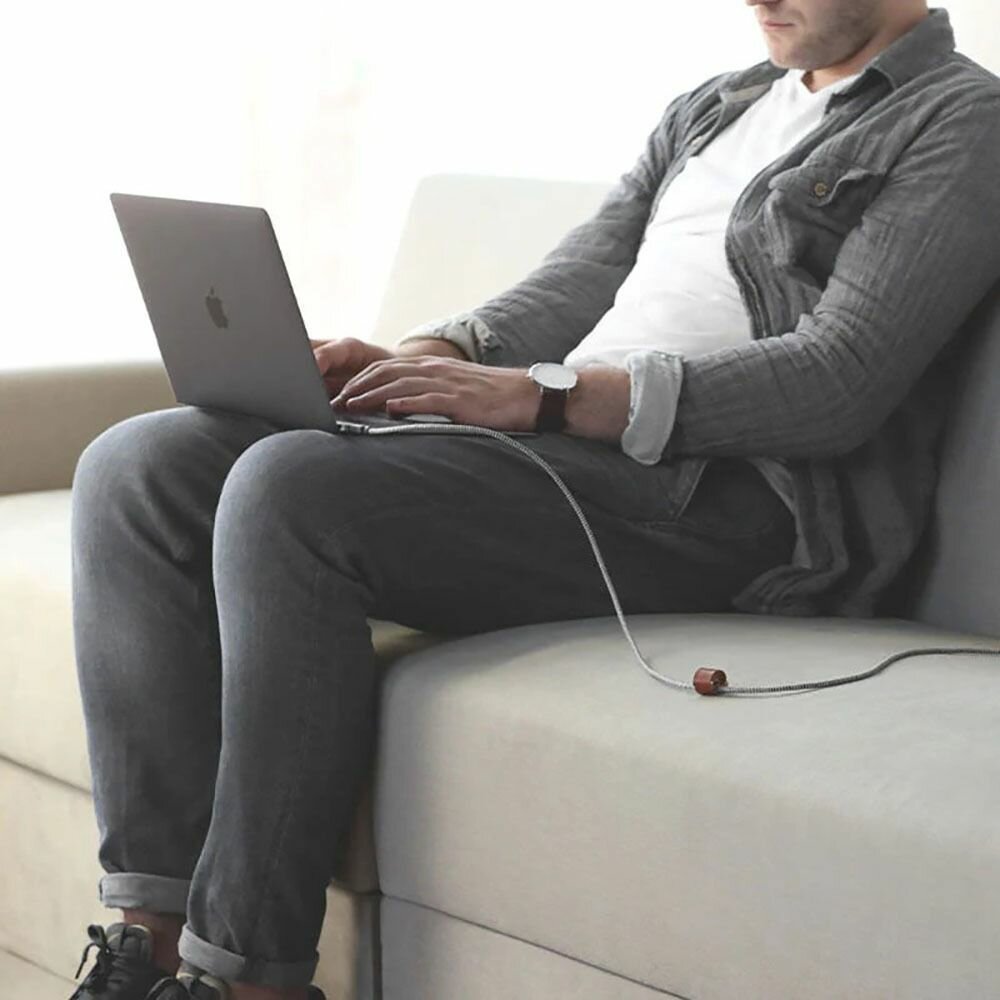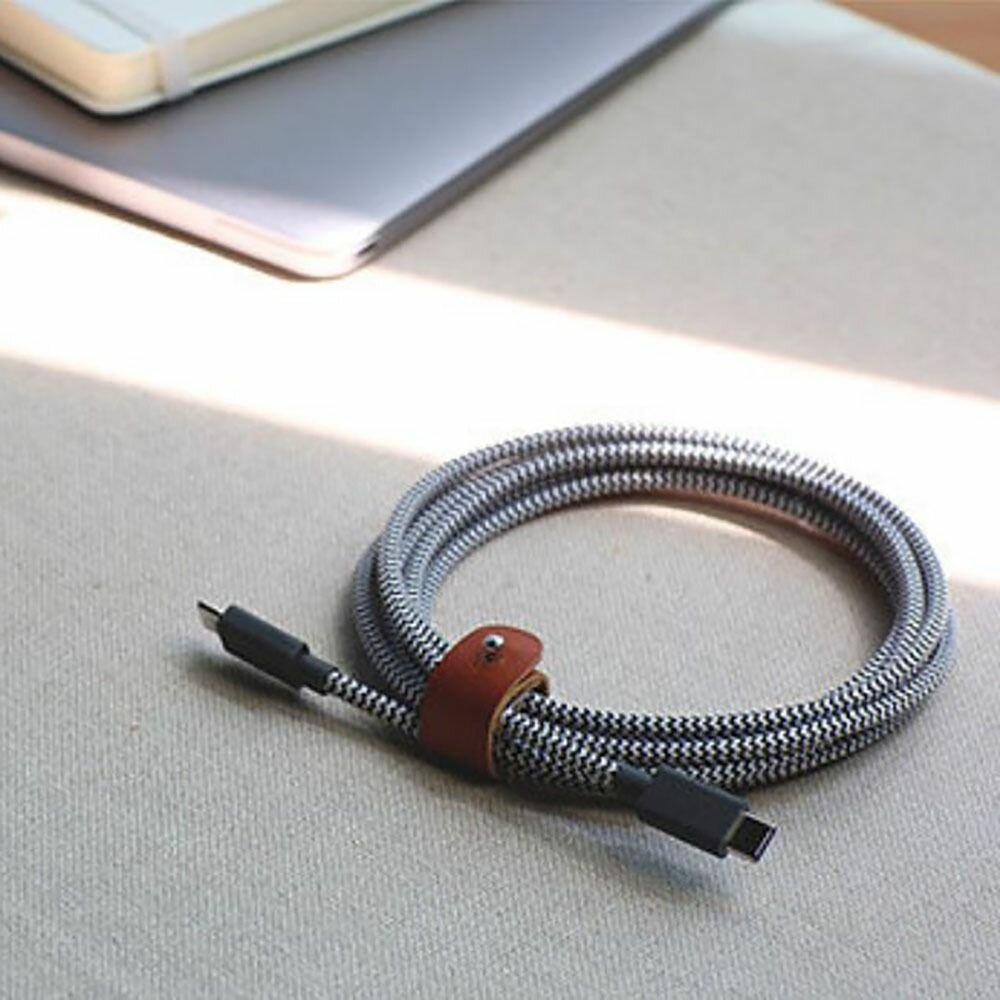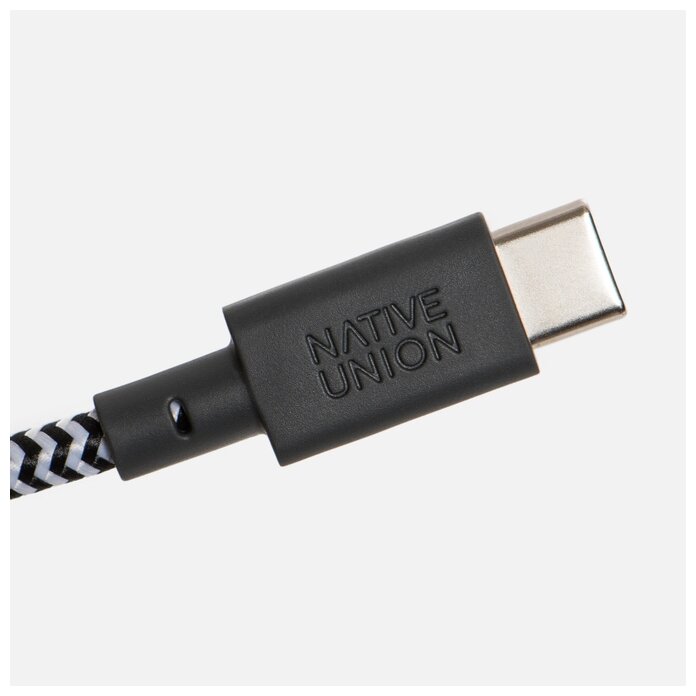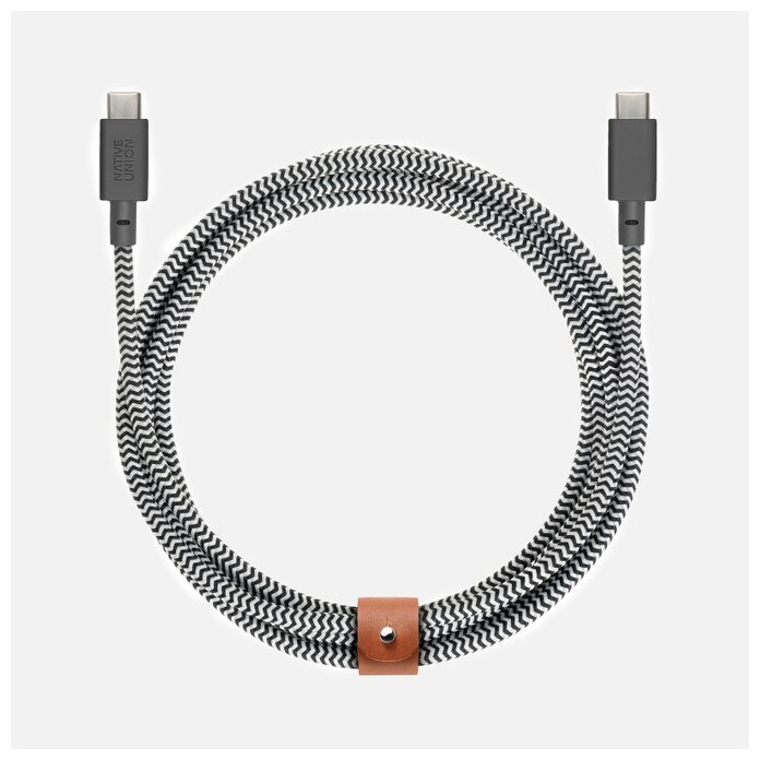 Кабель Native Union USB-C – USB-C снабжен двумя реверсивными штекерами. Он может использоваться для подключения мобильных девайсов последних поколений к MacBook и другим современным компьютерам. Провод может передавать данные и заряжать батареи устройств, подавая на них ток с силой до 3 А. Максимальная надежность. Многослойная тканевая оплетка делает кабель устойчивым к переламыванию, растяжениям, разрывам и другим механическим повреждениям. Гибкие крепления его штекеров выдерживают до 10 тысяч поворотов на 90 градусов.Защита от помех. Качественное экранирование блокирует электромагнитное излучение, продлевая срок службы аккумуляторов и поддерживая высокую скорость передачи данных.Удобство использования. Застежка из натуральной кожи, включенная в комплект, позволяет закреплять кабель во время транспортировки, предотвращая его спутывание.