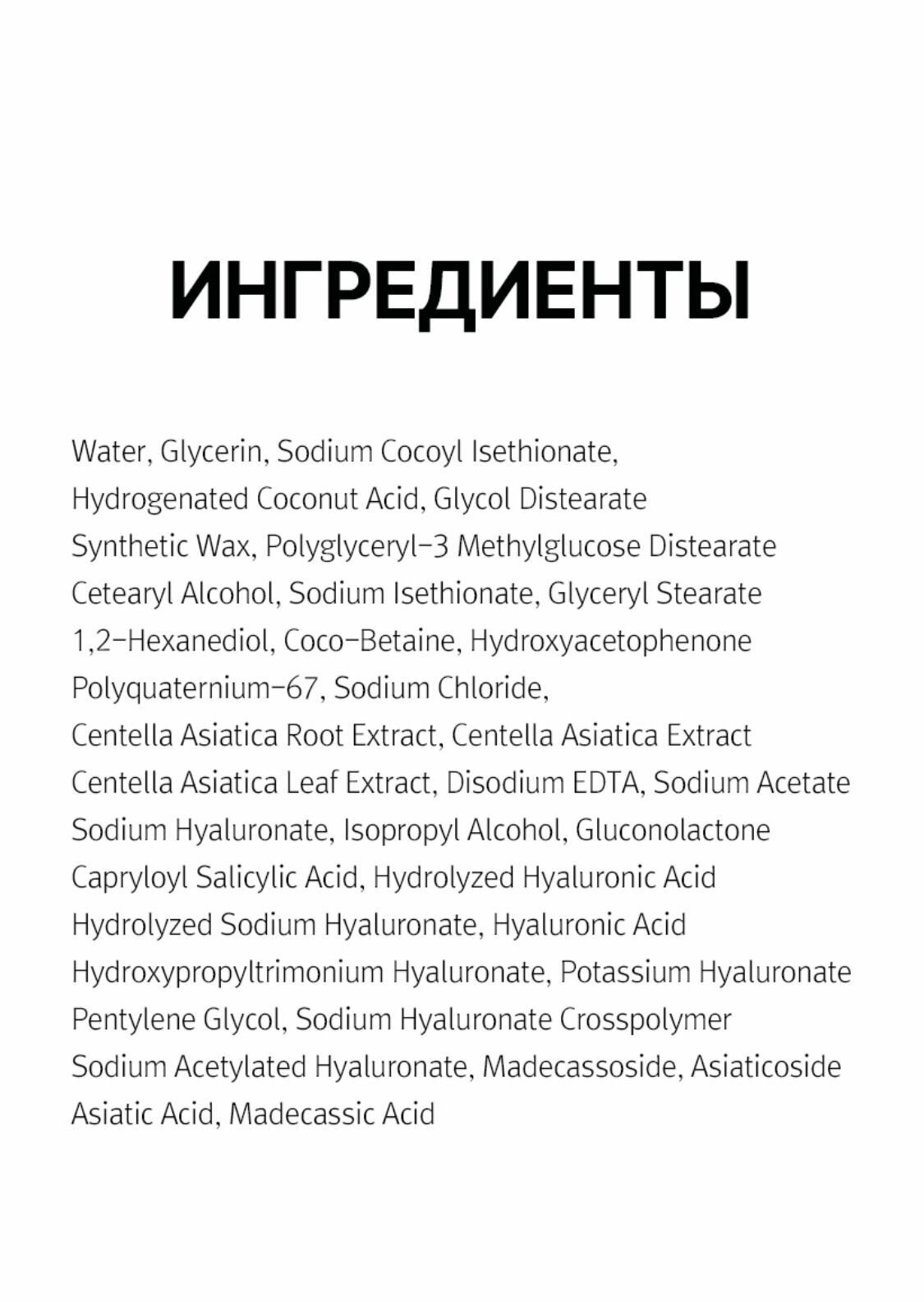 | Состав | Water, Glycerin, Sodium Cocoyl Isethionate, Hydrogenated Coconut Acid, Glycol Distearate Synthetic Wax, Polyglyceryl-3 Methylglucose Distearate Cetearyl Alcohol, Sodium Isethionate, Glyceryl Stearate 1,2-Hexanediol, Coco-Betaine, Hydroxyacetophenone Polyquaternium-67, Sodium Chloride, Centella Asiatica Root Extract, Centella Asiatica Extract Centella Asiatica Leaf Extract, Disodium EDTA, Sodium Acetate Sodium Hyaluronate, Isopropyl Alcohol, Gluconolactone Capryloyl Salicylic Acid, Hydrolyzed Hyaluronic Acid Hydrolyzed Sodium Hyaluronate, Hyaluronic Acid Hydroxypropyltrimonium Hyaluronate, Potassium Hyaluronate Pentylene Glycol, Sodium Hyaluronate Crosspolymer Sodium Acetylated Hyaluronate, Madecassoside, Asiaticoside Asiatic Acid, Madecassic Acid. |