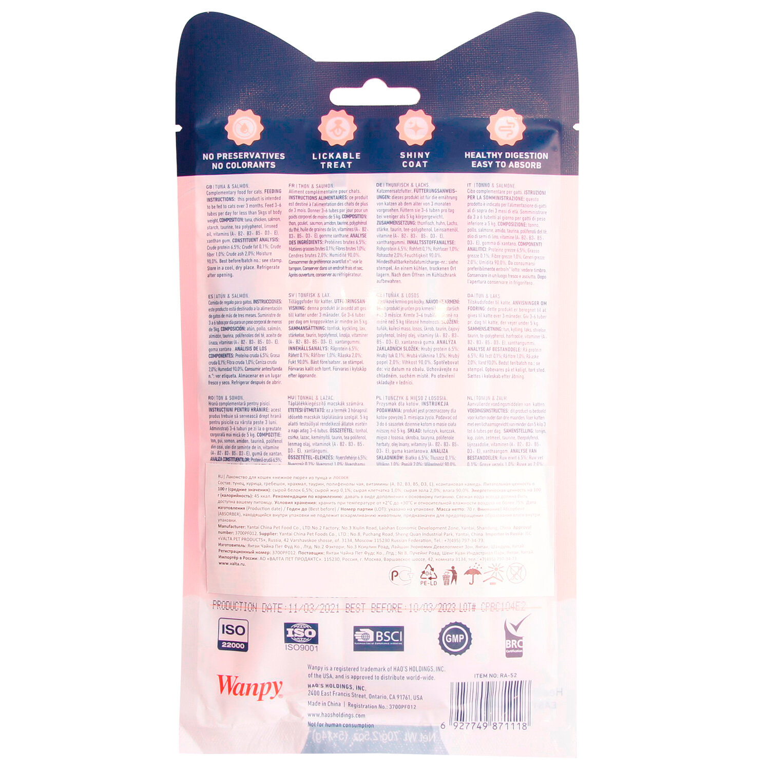 Ингредиенты: Состав: тунец, курица, лосось, крахмал, таурин, полифенолы чая, льняное масло, витамины (A, B2, B3, B5, D3, E), ксантановая камедь.