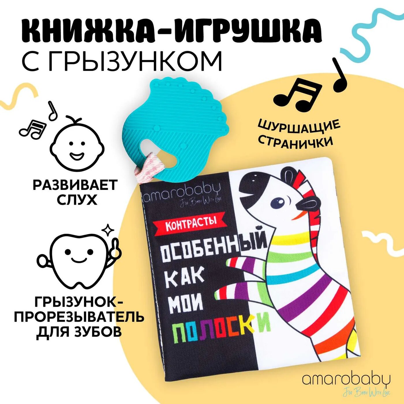 Занимательная книжка-игрушка Amarobaby станет первой любимой мягкой книгой для малыша. Ваш малыш будет с удовольствием изучать книгу и развивать тактильные ощущения. Мягкие книги станут вашим верным помощником в развитии малыша, начиная с рождения. Возьмите развивающую книжку с собой в машину, на прогулку,в гости, в путешествие. Яркие картинки заинтересуют и займут вашего малыша. У книжек- игрушек на уголке есть мягкий прорезываетесь из термопластичной резины.