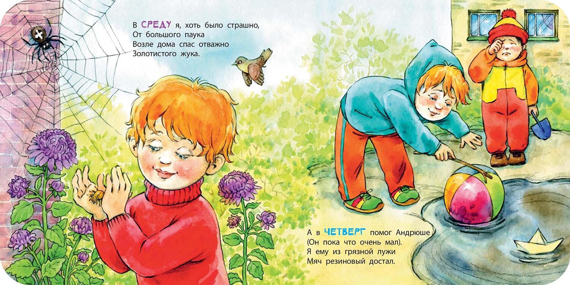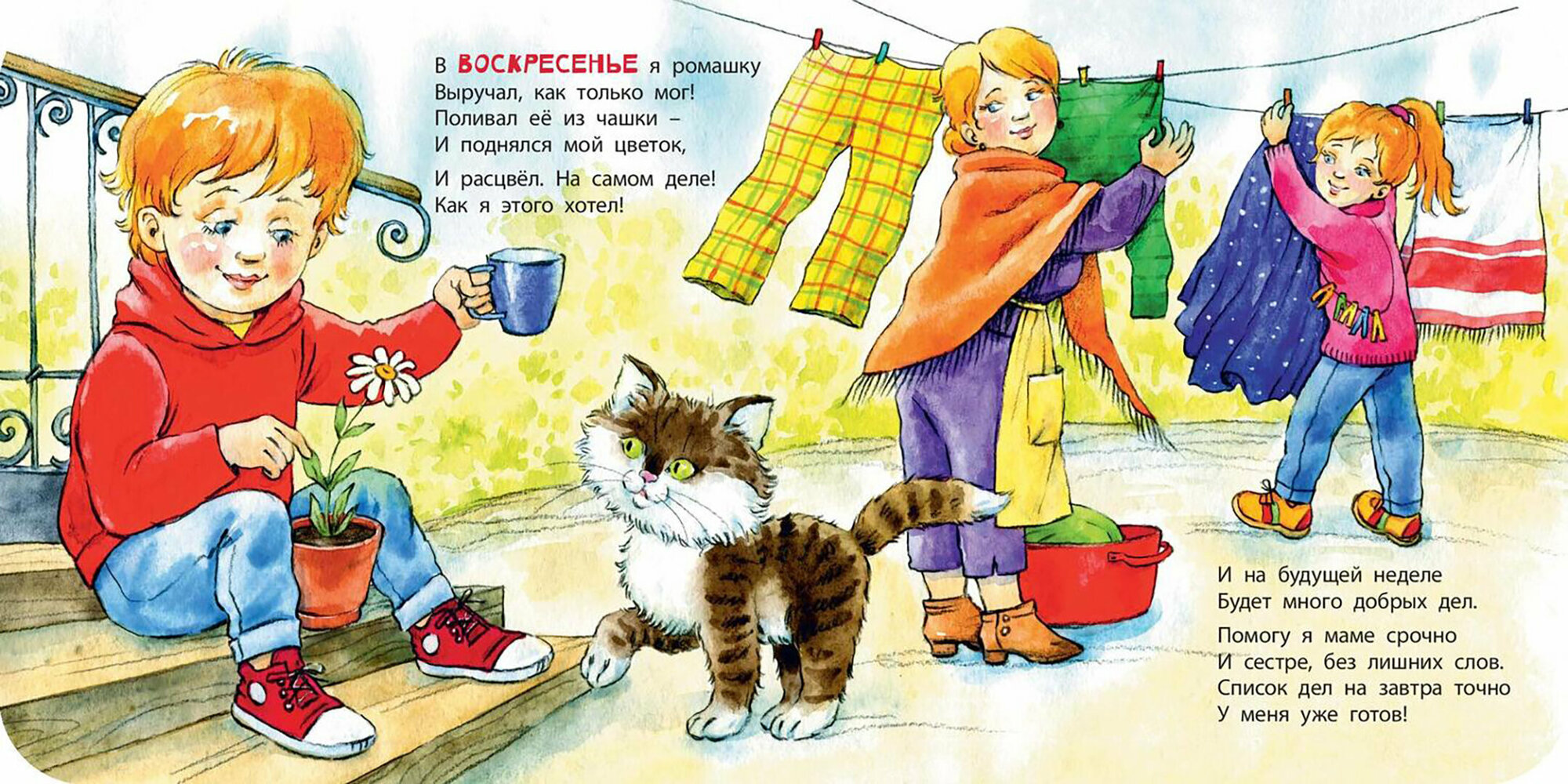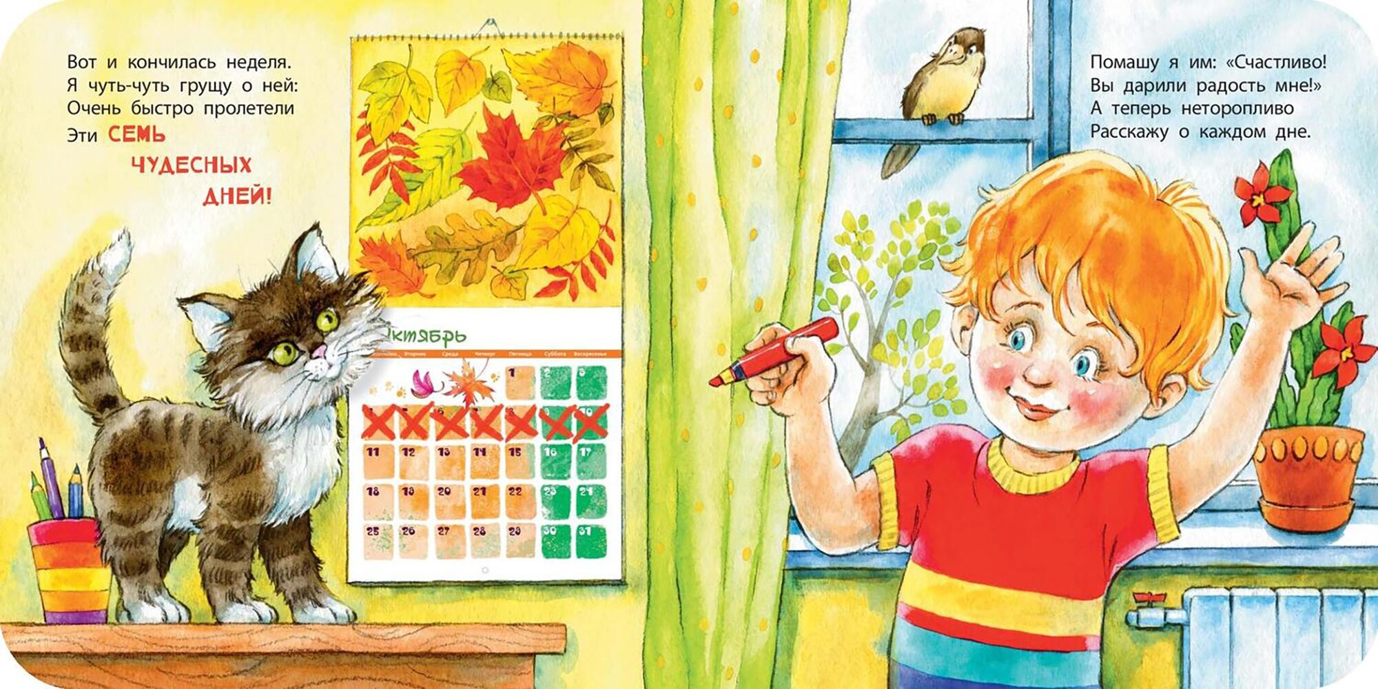 Маленький герой этой книжки был занят всю неделю: каждый день у него находилось какое-нибудь важное и полезное дело. Мальчик с радостью помогал всем, кому мог, – малышам, бабушке, птичкам, – и даже кое-кого спасал! И на следующую неделю он уже подготовил новый список хороших дел.