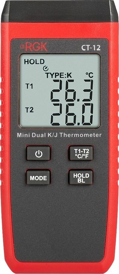 Контактный термометр RGK CT-12 с погружным зондом температуры TR-10W - это надежный и точный прибор для измерения температуры в диапазоне от -40°С до +400°С с комплектной термопарой. Погрешность при этом составляет не более ± 1,5 °C. Главное преимущество этой модели - 2 гнезда для подключения выносных датчиков с функцией определения разности между каналами. Благодаря обширным измерительным возможностям и точности прибор может использоваться как для бытовых, так и для профессиональных измерений при работе с промышленным оборудованием, распределительными щитами, системами отопления, электродвигателями и др.