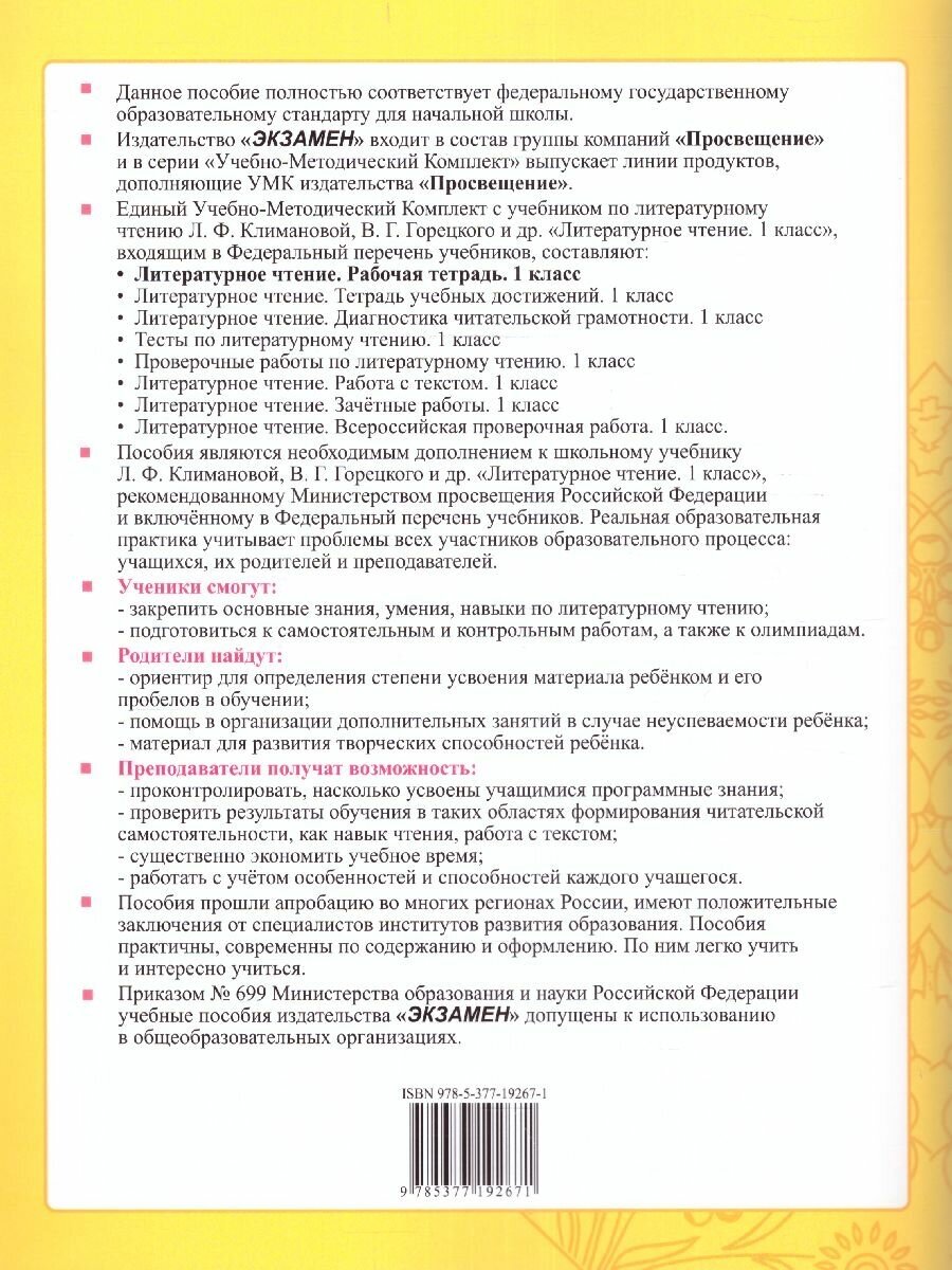 Рабочая тетрадь является дополнением к школьному учебнику по литературному чтению для 1 класса авторов Л. Ф. Климановой, В. Г. Горецкого и др.