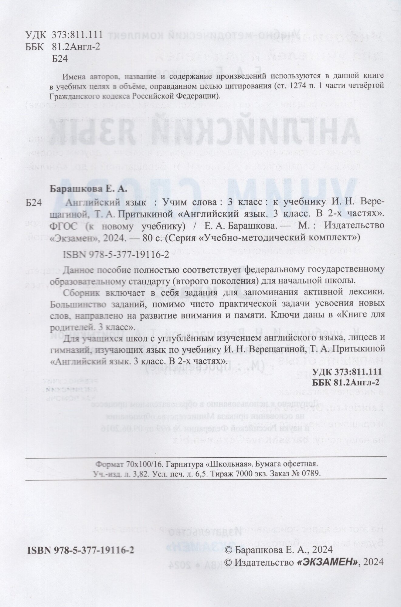 Английский язык. 3 класс. Учим слова. К учебнику И. Н. Верещагиной Т. А. Притыкиной (Барашкова Елена Александровна); Экзамен Издательство, 2024