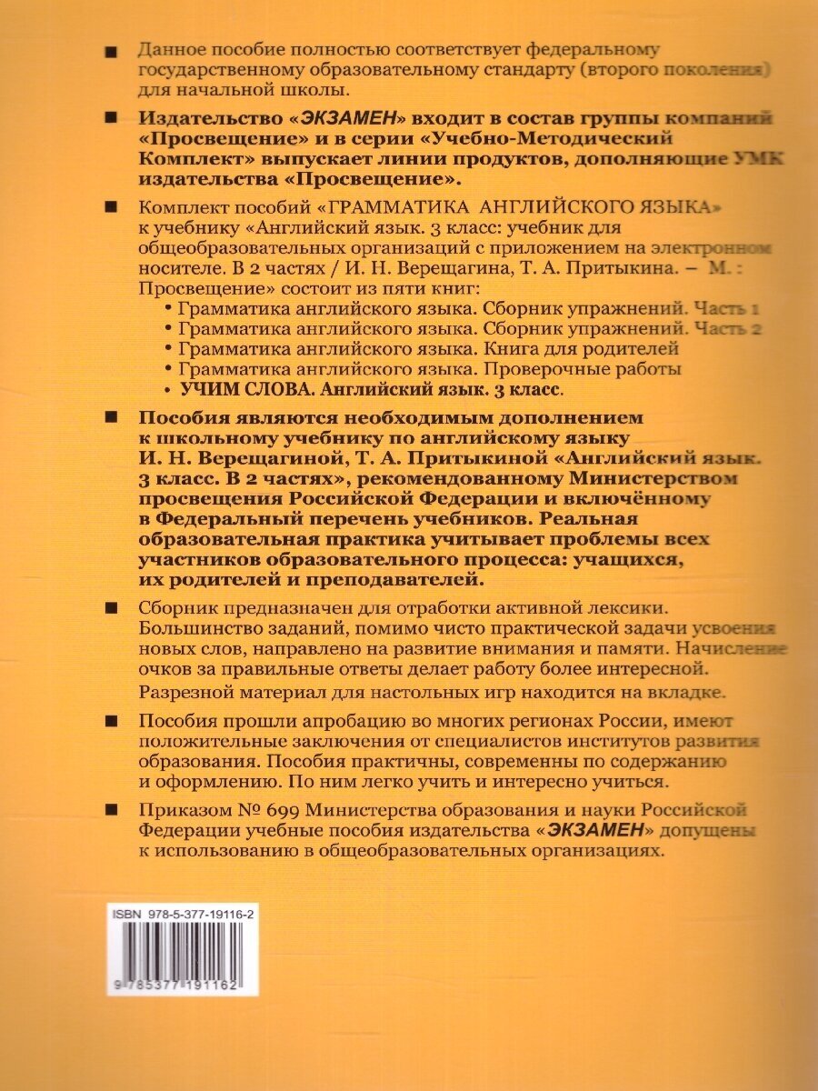 Данное пособие полностью соответствует федеральному государственному образовательному стандарту (второго поколения) для начальной школы. Сборник включает в себя задания для запоминания активной лексики. Большинство заданий, помимо чисто практической задачи усвоения новых слов, направлено на развитие внимания и памяти. Ключи даны в "Книге для родителей. 3 класс". Для учащихся школ с углублённым изучением английского языка, лицеев и гимназий, изучающих язык по учебнику И. Н. Верещагиной, Т. А. Притыкиной "Английский язык. 3 класс. В 2-х частях".