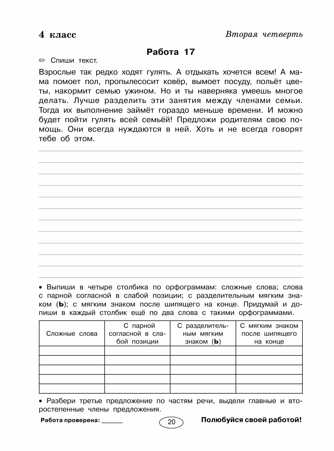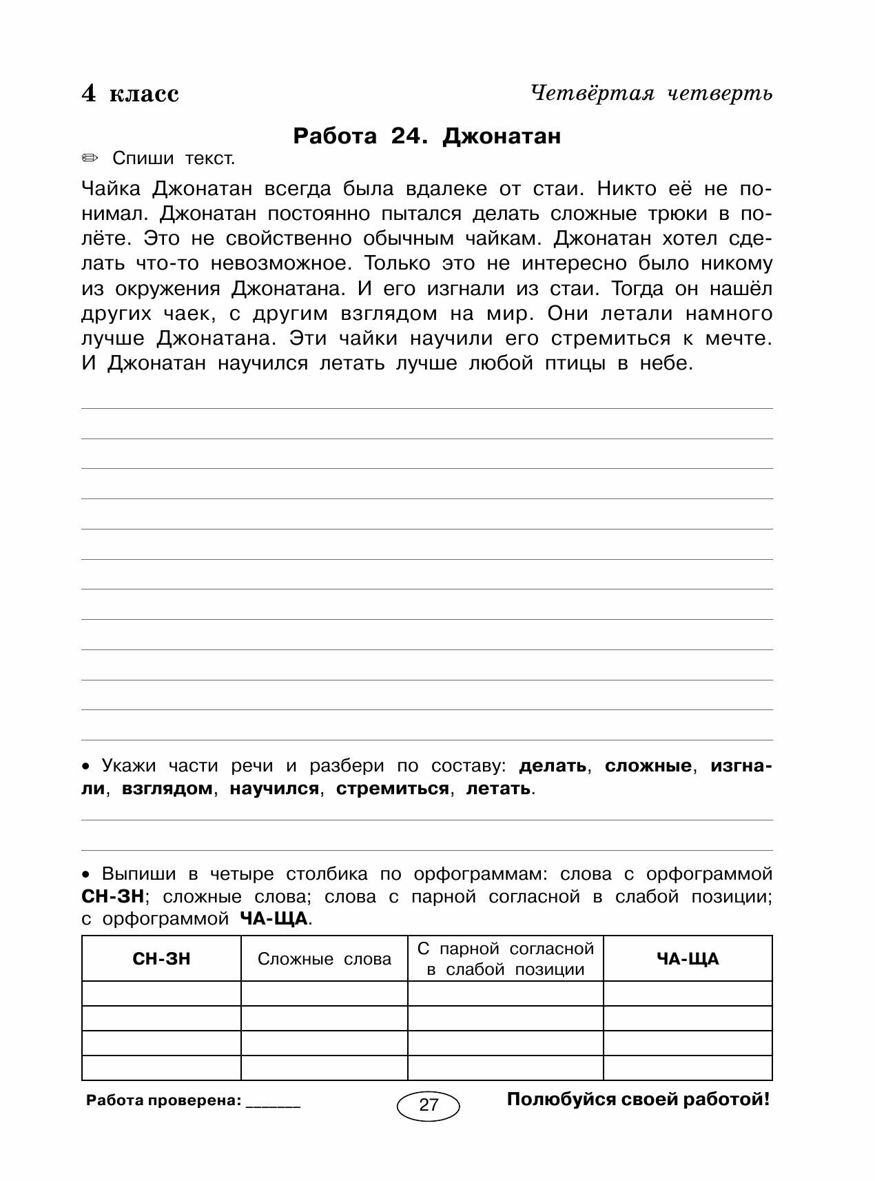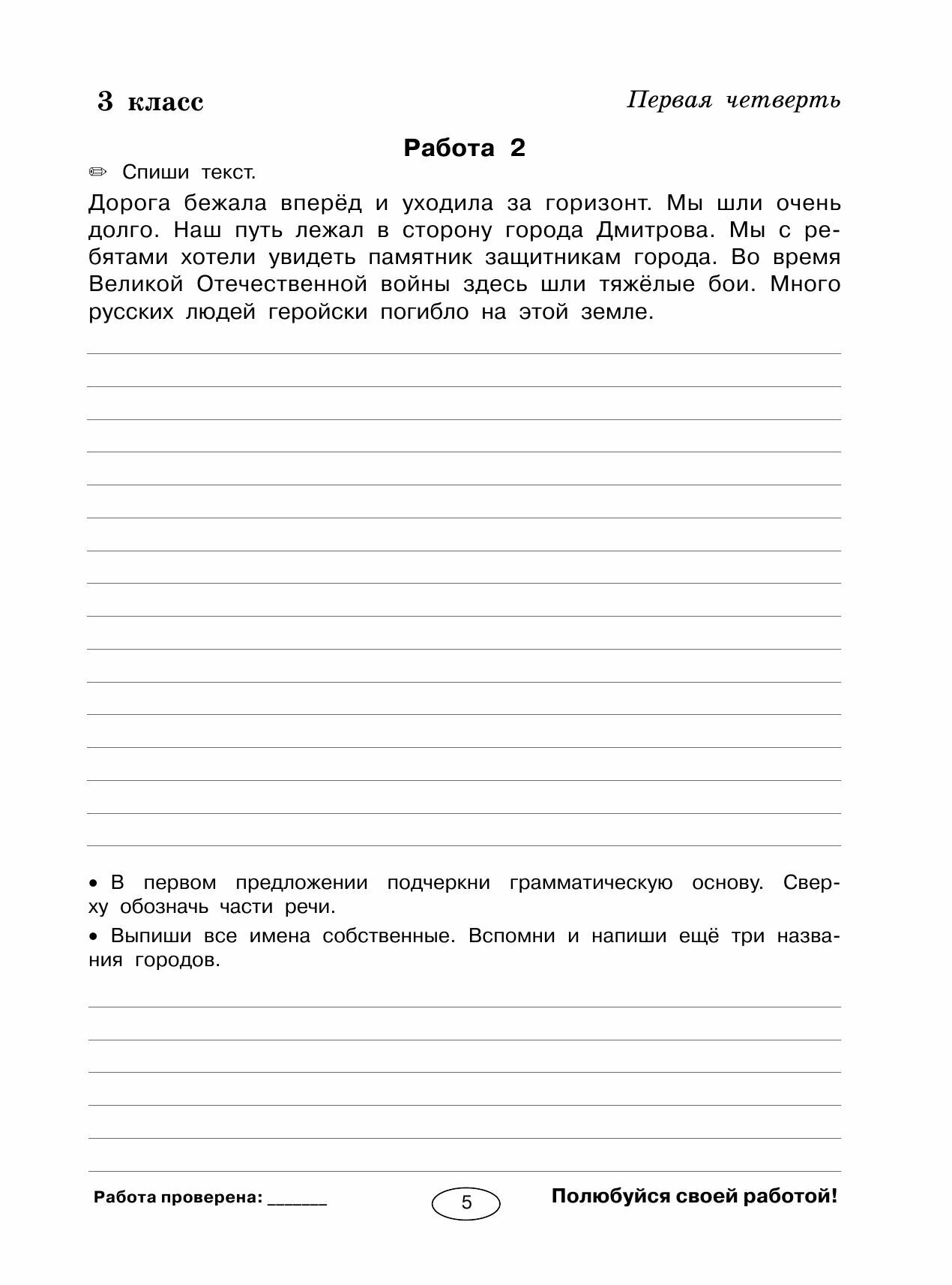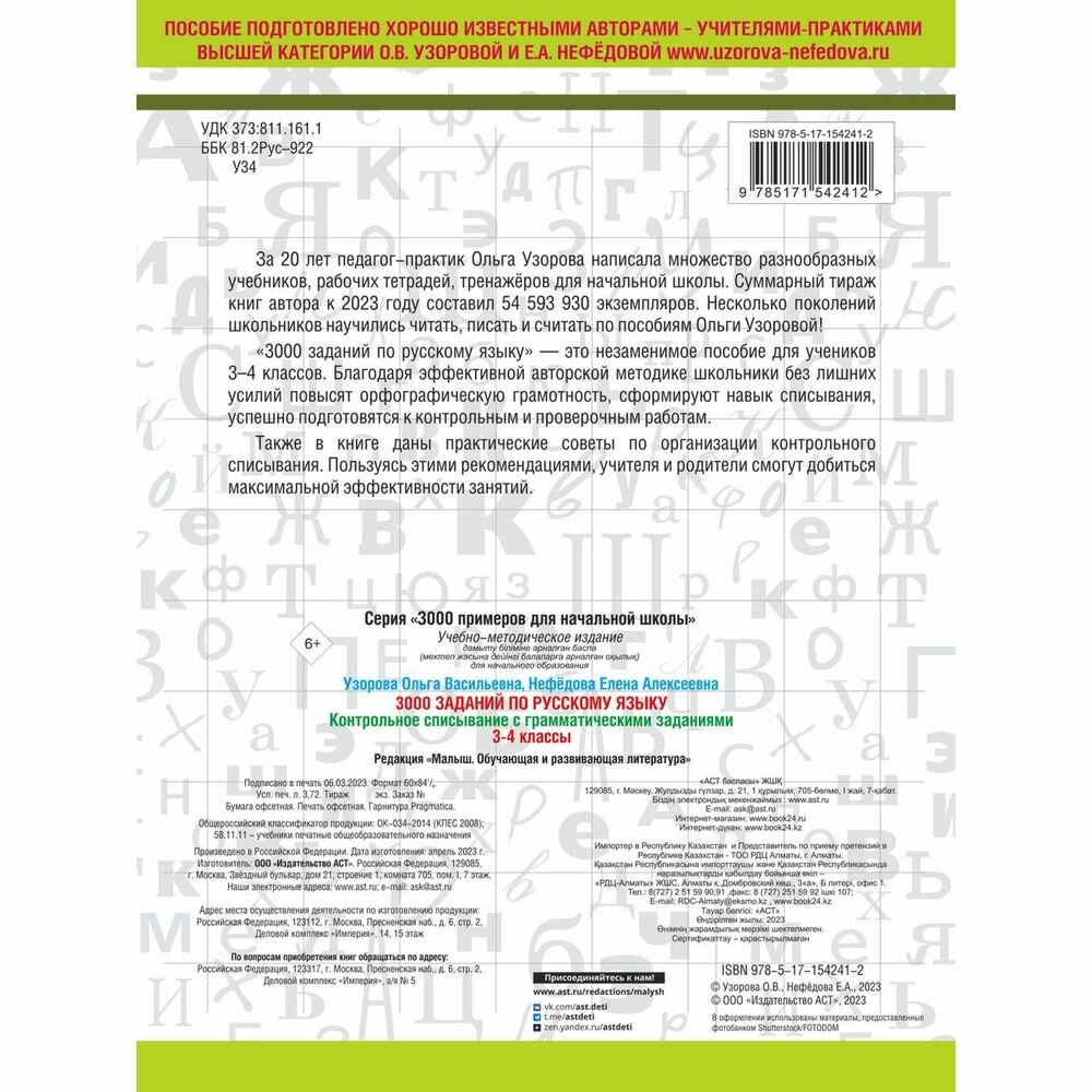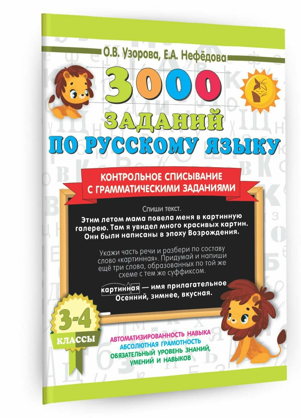 "3000 заданий по русскому языку. 3–4 классы. Контрольное списывание с грамматическими заданиями" — это рабочая тетрадь, основанная на эффективной авторской методике известного педагога-практика О. В. Узоровой. Списывая тексты, школьники сформируют навык быстрого безошибочного письма, успешно подготовятся к контрольным и проверочным работам. К каждому тексту даны дополнительные задания на развитие орфографической грамотности.