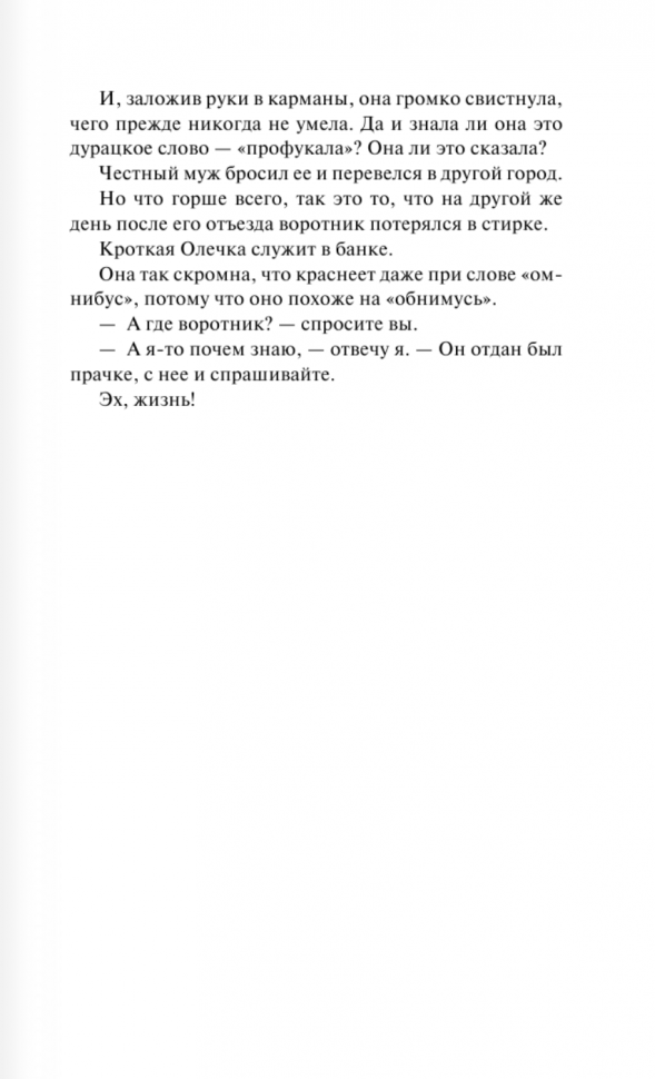 Все они попадают в комичные и нелепые ситуации, и над каждым из них посмеивается Тэффи — с жалостью и снисхождением, но чаще — с тонкой иронией. Остроумие Тэффи поистине великолепно, а ее душевные юмористические рассказы абсолютно искренни, поэтому они и сейчас пользуются заслуженной популярностью.