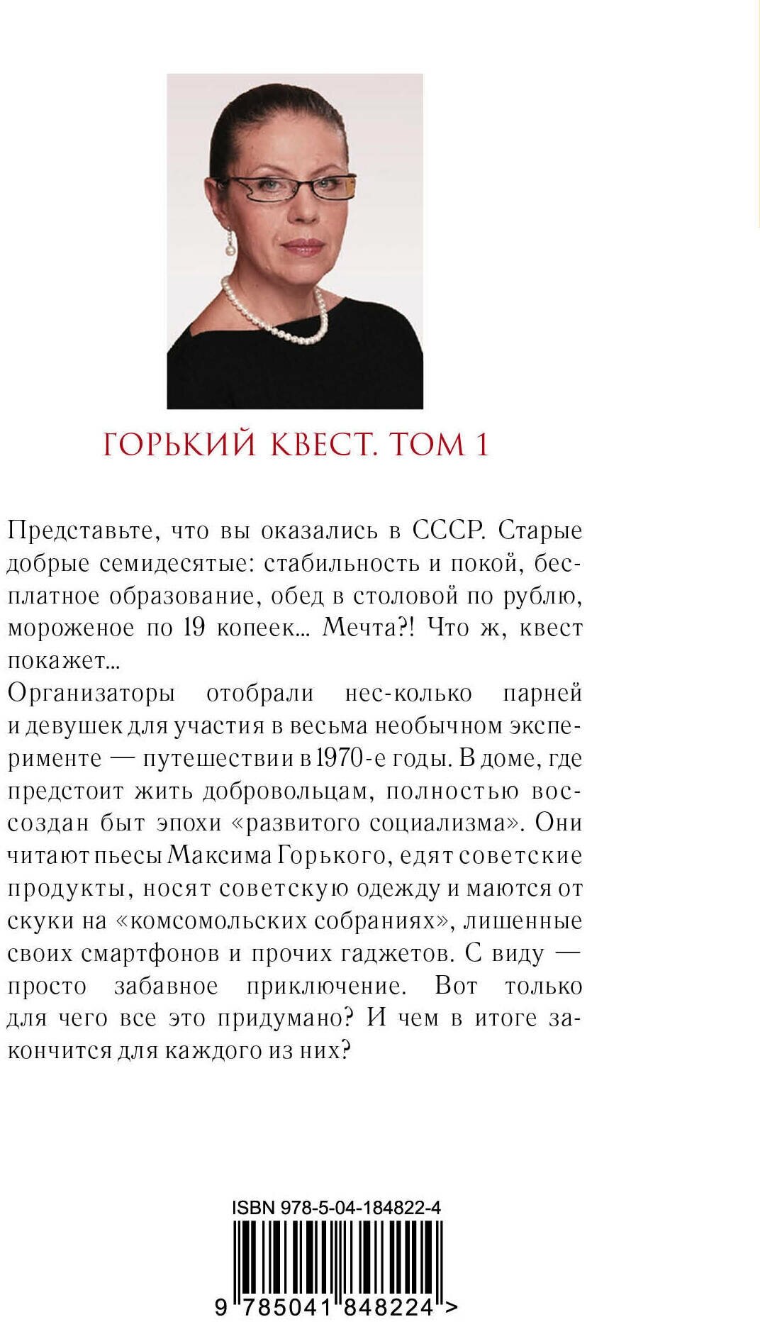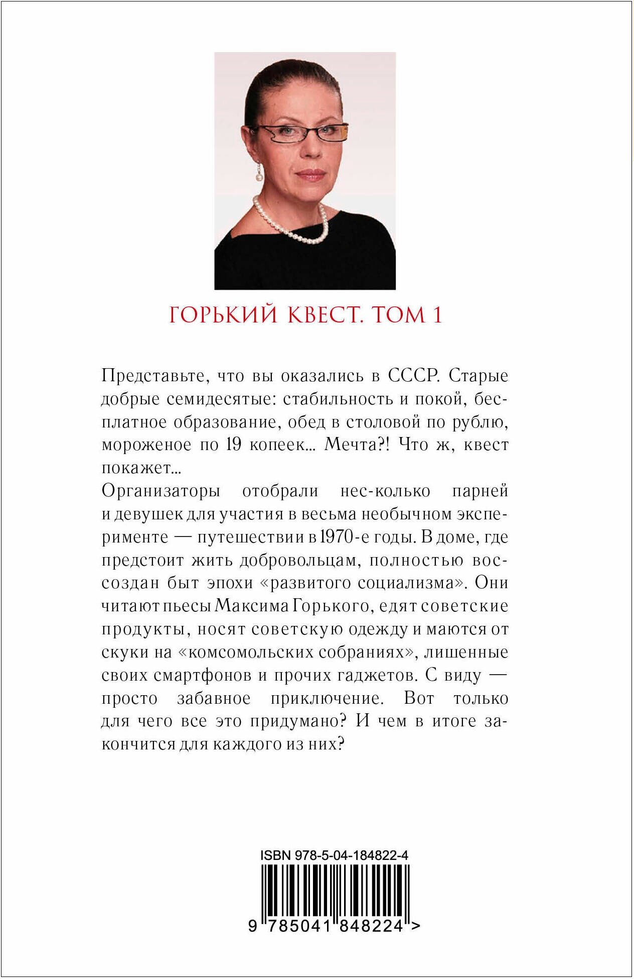 «Горький квест» — это невероятный эксперимент по погружению современных молодых людей в советскую эпоху 70-х годов. Для написания этого произведения Александра Маринина организовала фокус-группы современной молодежи и их реальные реакции описала в книге.
