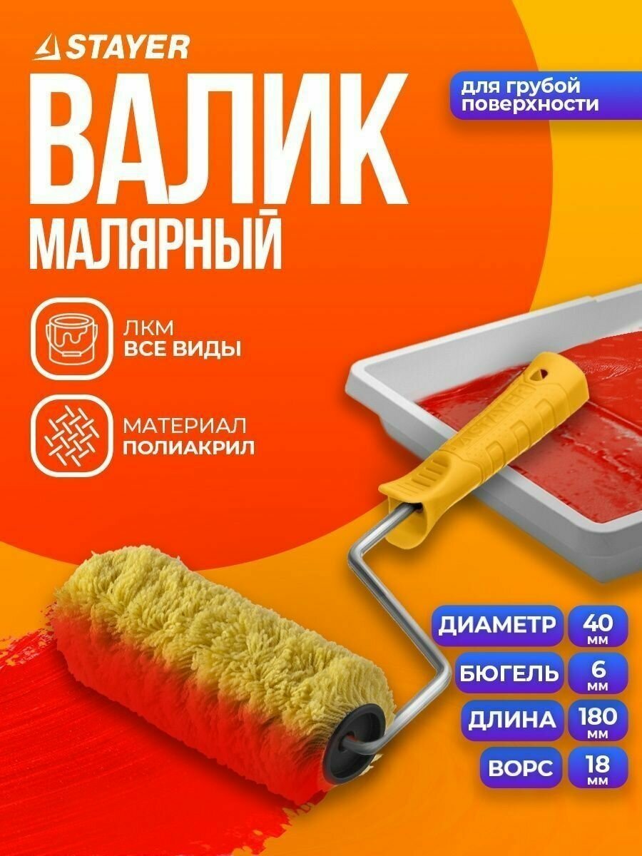 Валик с ручкой STAYER Syntex 40 180 мм ?40 мм полиакрил (_z01)Модель - _z01Технические характеристики:-Длина: 180 мм-Внешний диаметр основы: 40 мм-Материал шубки: полиакрил -Высота ворса: 18 мм-Виды лкм: UNIVERSAL - все виды ЛКМ -Диаметр бюгеля: 6 мм-Технология производства: thermofusion -Обрабатываемая поверхность: грубаяВалики из полиакрила используютсядля нанесения красок на водной основе или красокс ограниченным содержанием растворителей.Имеют длительный срок службы, оптимальныдля грубых поверхностей. Для нанесениялаков не подходят, так как могут оставлять волокна.Преимущества:-- Идеален для окрашивания неровных поверхностей;-- Создает равномерный качественный слой;