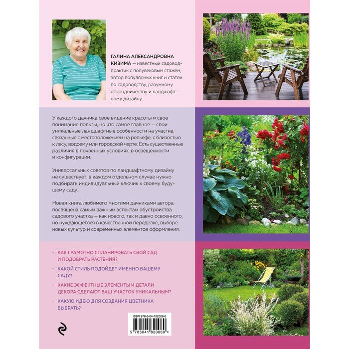 "Не существует универсальных советов по ландшафтному дизайну, и в каждом отдельном случае придется подбирать "индивидуальный ключик" к своему будущему саду", - утверждает Галина Кизима - известный садовод-практик с полувековым стажем, автор множества книг и статей по садоводству, огородничеству и ландшафтному дизайну.
