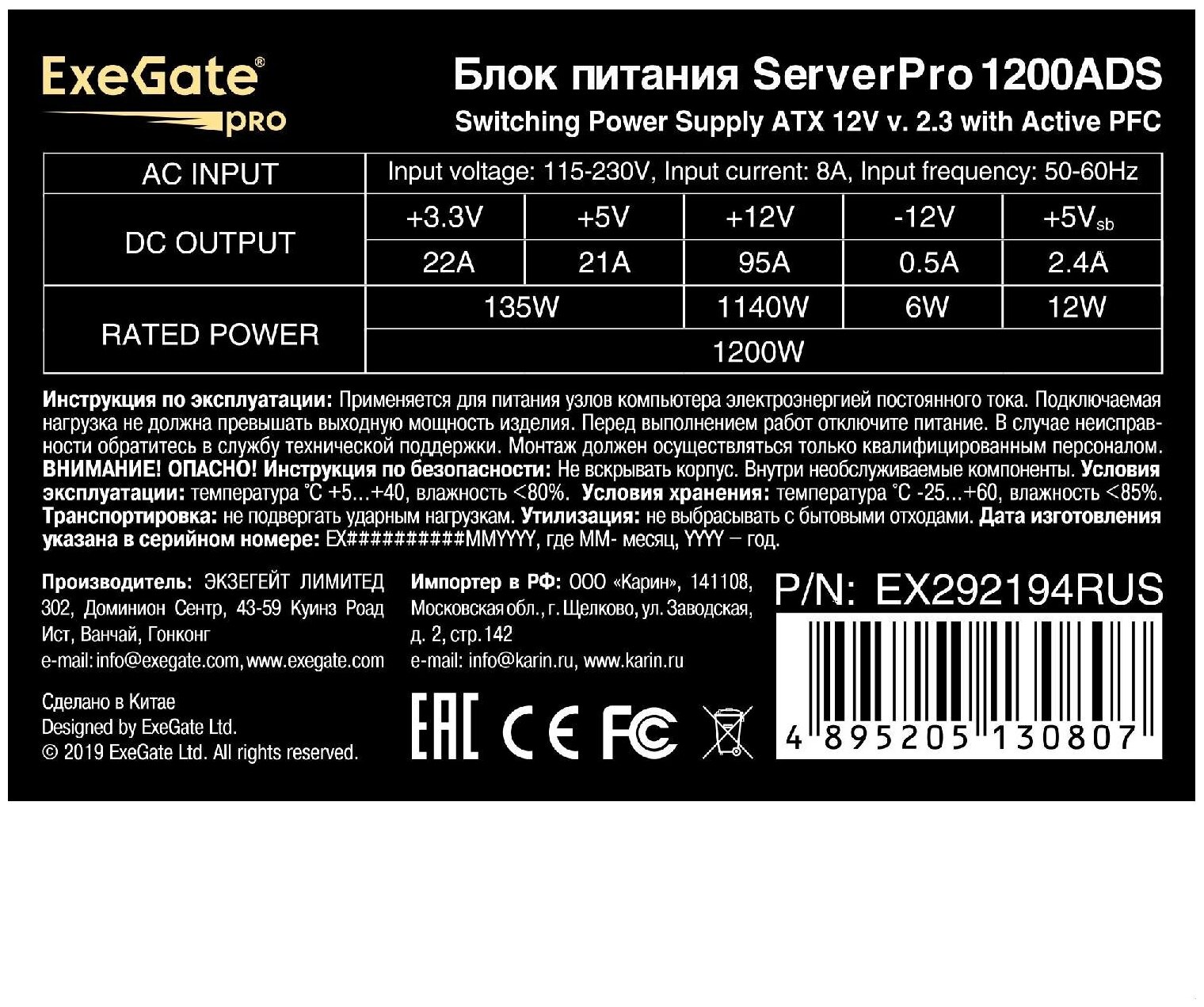 Серверный БП 1200W ExeGate (ATX, APFC, КПД 82% (80 PLUS), 2x8cm fans, 24pin, 2x(4+4)pin, 2xPCIe, 10xSATA, 5xIDE, black)