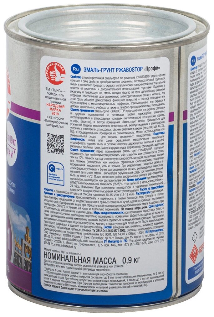 Эмаль на алкидной основе для окраски металлических поверхностей с остатками ржавчины внутри и снаружи помещений (гаражи, ограды, решетки); для окраски деревянных поверхностей. Расход 1 кг на 10-15 м в один слой, время высыхания 5-7 часов.