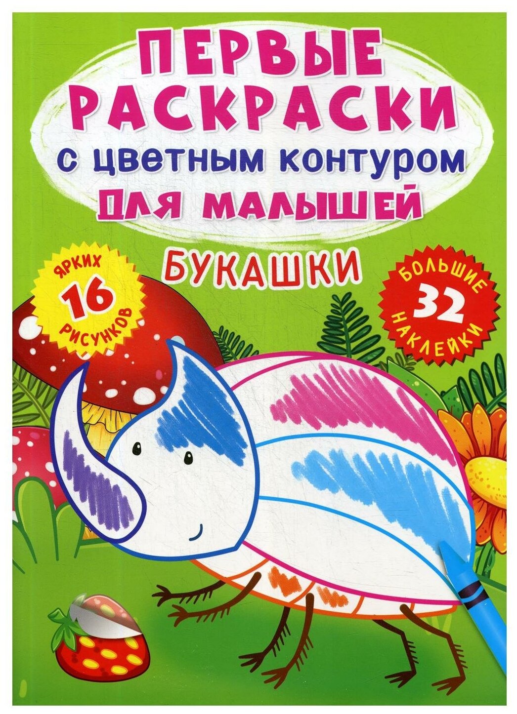 Рисование — увлекательнейшее занятие, вот почему маленькие художники просто обожают раскраски. Мы подготовили для них сюрприз — замечательную книжку, в которой изображения имеют не чёрный, а цветной контур. Это подскажет малышу, какую краску нужно выбрать, чтобы получить яркую и красивую картинку. Раскрашивайте букашек, наклеивайте стикеры и учите новые слова!