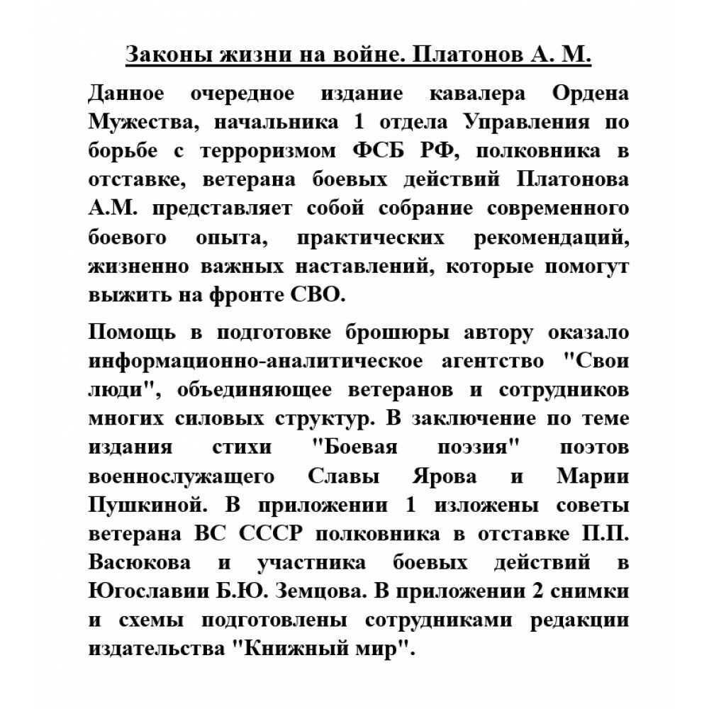 Данное очередное издание кавалера Ордена Мужества, начальника 1 отдела Управления по борьбе с терроризмом ФСБ РФ, полковника в отставке, ветерана боевых действий Платонова A.M. представляет собой собрание современного боевого опыта, практических рекомендаций, жизненно важных наставлений, которые помогут выжить на фронте СВО.