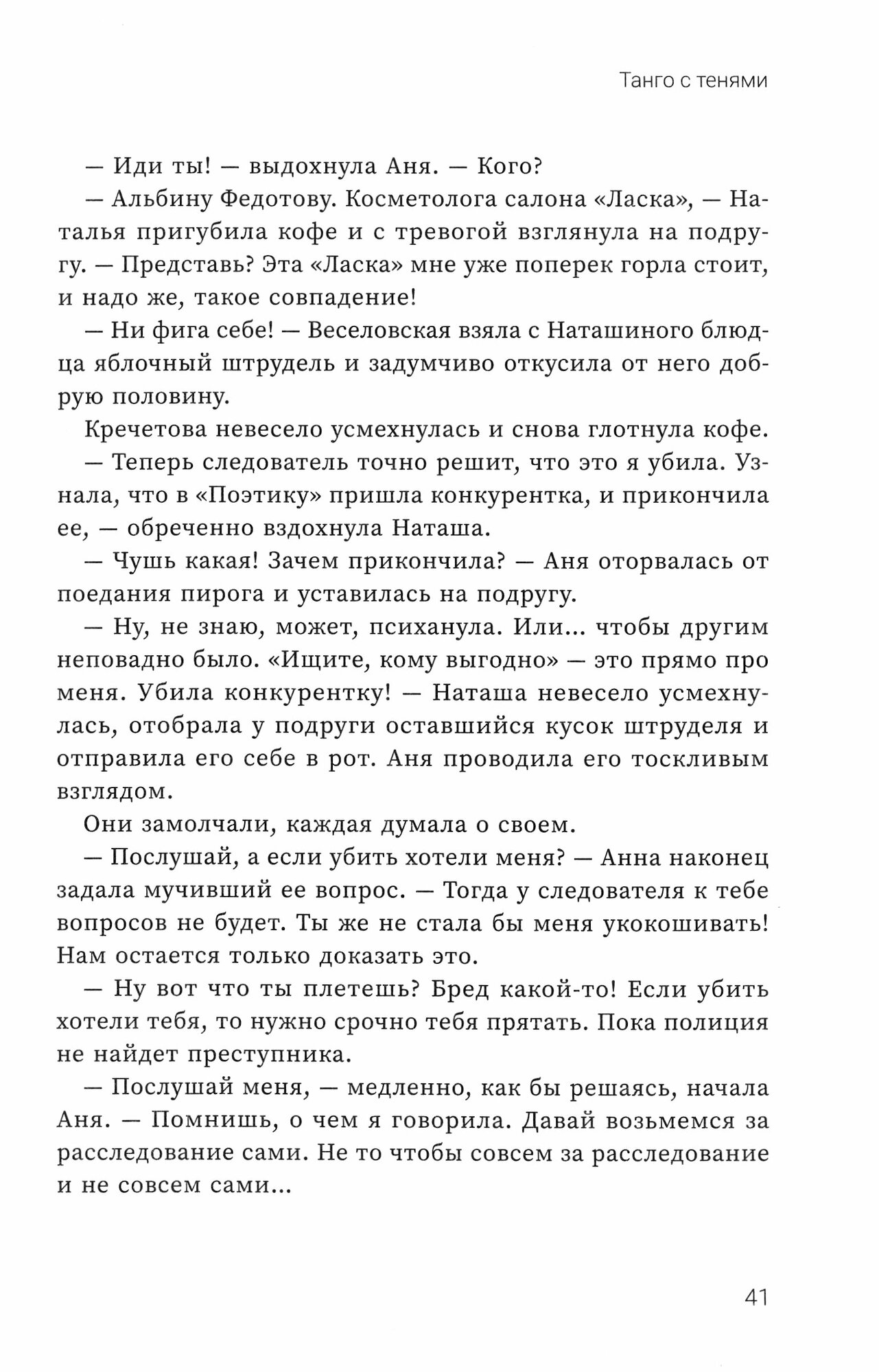 Ну наконец-то! Наконец-то издательство обратило внимание на эту талантливую писательницу и стало выпускать ее книги. Если после первой книги я была в восторге, то эта мне понравилась еще больше. Великолепный детектив с не избитым сюжетом, отличными героями и шикарным юмором. Если вы устали от массы примитивных и проходных книг, то "Танго с тенями" - глоток свежего воздуха в этом жанре.