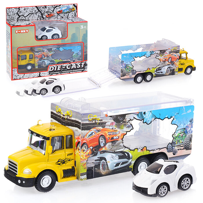 Игрушка от бренда Funky Toys Набор грузовик+машинка FТ61050 несомненно понравится вашему ребенку. Компактный грузовик с металлической кабиной и прозрачным кузовом с необычным дизайном перевозит машины на место гонок. Внутри кузова грузовика есть спусковой механизм для заезда гоночной машины, а верхняя часть кузова становится выкатной дорожкой. Яркая металлическая гоночная машинка, которая идет в комплекте, даст фору любому, ведь фрикционный механизм позволяет ей сразу набрать приличную скорость. Одно нажатие спусковой кнопки-и машинка устремляется вперед! С помощью специального крепления можно соединить вместе два грузовика для синхронных заездов. Проведи соревнования прямо на трассе.