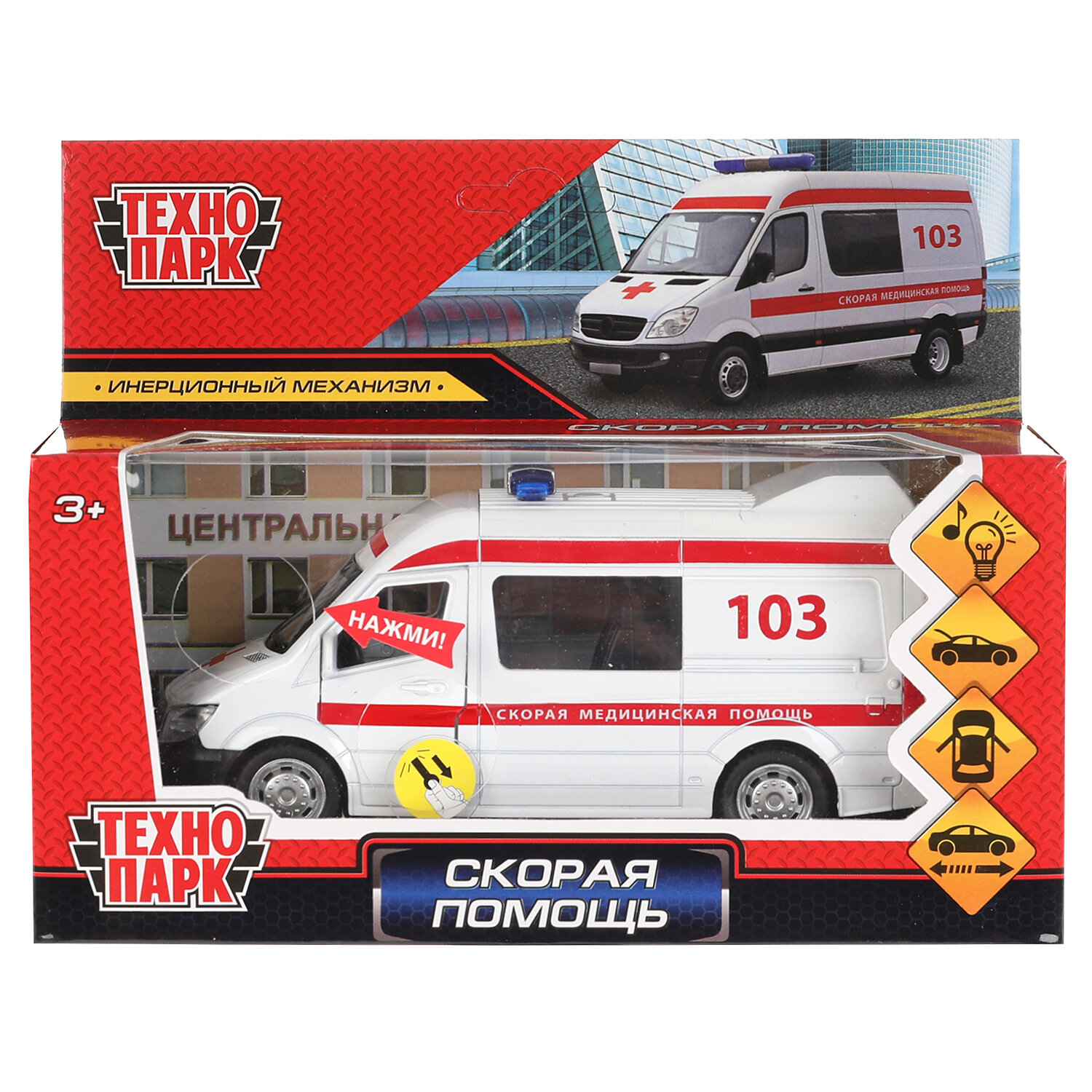 Машина металл свет-звук СКОРАЯ ПОМОЩЬ 145см двери багаж 887-27А-R ТЕХНОПАРК