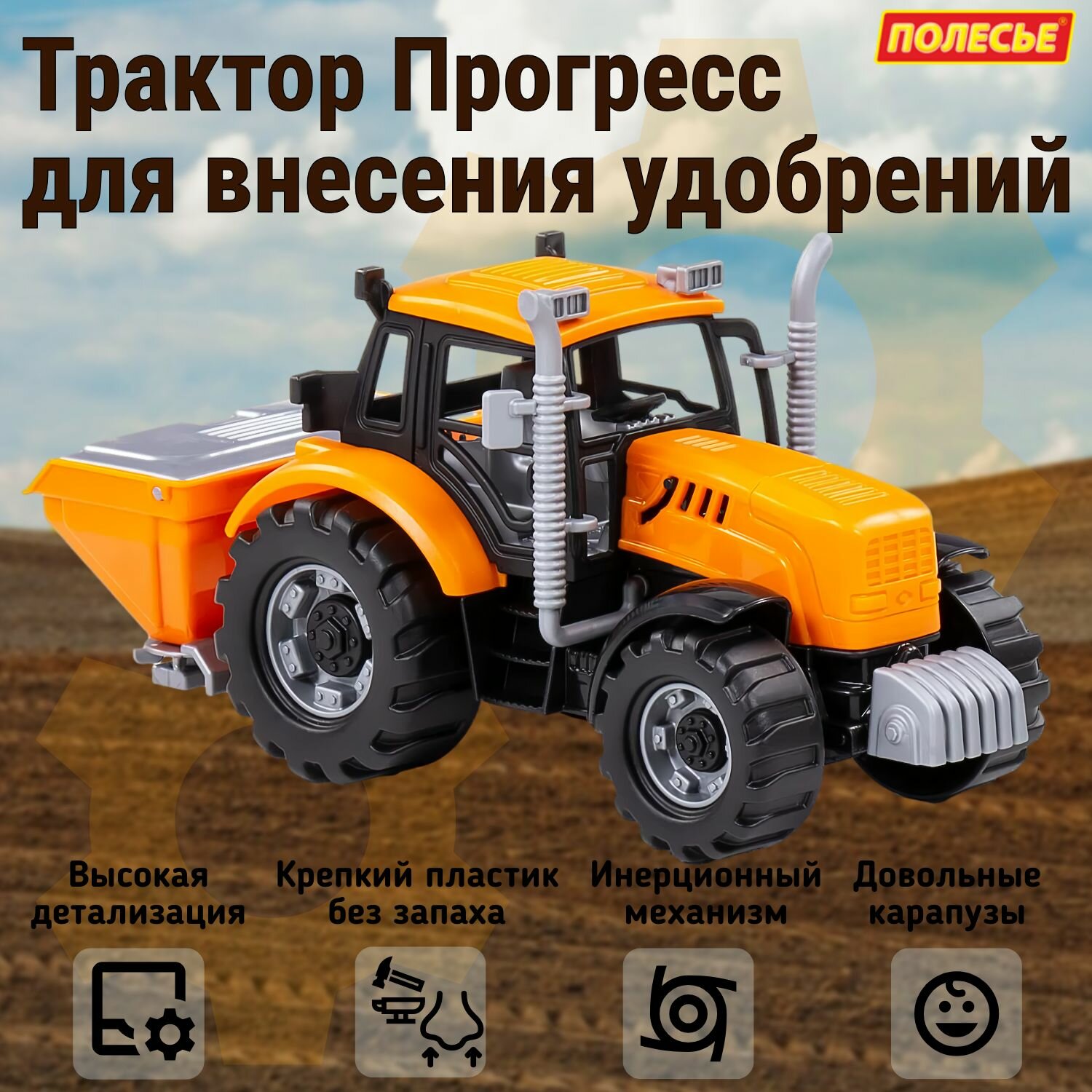 Игрушка от бренда Полесье Трактор Прогресс сельскохозяйственный инерционный 91246 несомненно понравится вашему ребенку. Трактор «Прогресс» инерционный от фабрики «Полесье» - это игрушечный аналог реальной спецтехники. Конструкция трактора выполнена максимально детализировано, Капот трактора может быть зафиксирован в открытом положении для «починки» во время игры. Трактор оснащен инерционным механизмом, который повышает проходимость на разных поверхностях. Прицеп для внесения удобрений (крышка прицепа поднимается) позволит разнообразить сценарии детских игр. Играть с ним увлекательно как дома, так и на свежем воздухе. Поставляется игрушка в яркой коробке.