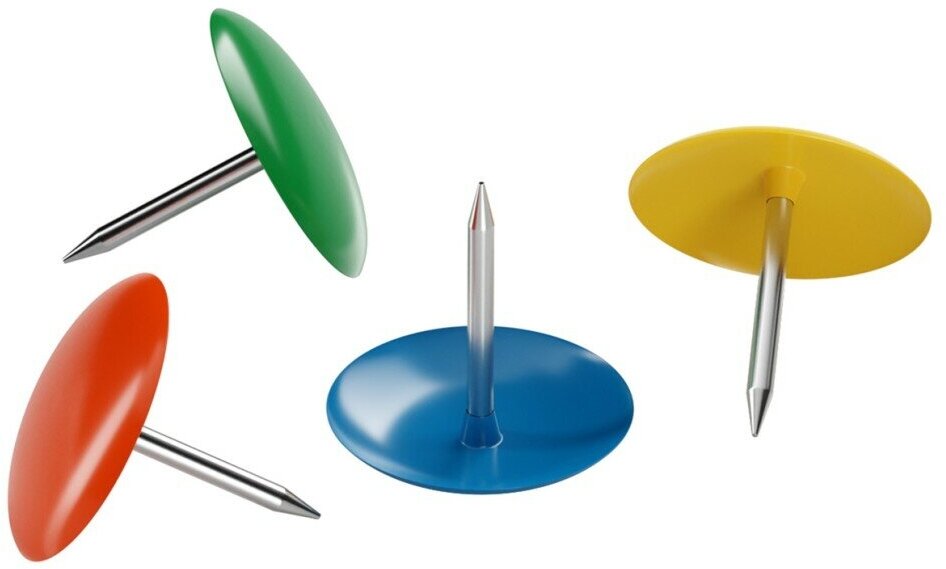 Кнопки-гвоздики никелированные с цветными головками для надёжного крепления бумаги. Диаметр - 10 мм, длина острия - 7 мм. Упаковка в картонную коробочку - по 50 шт.