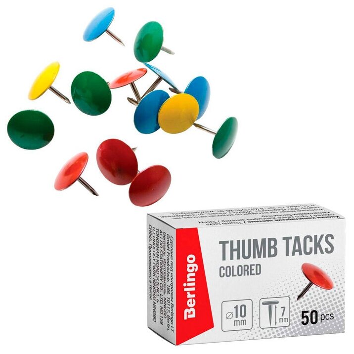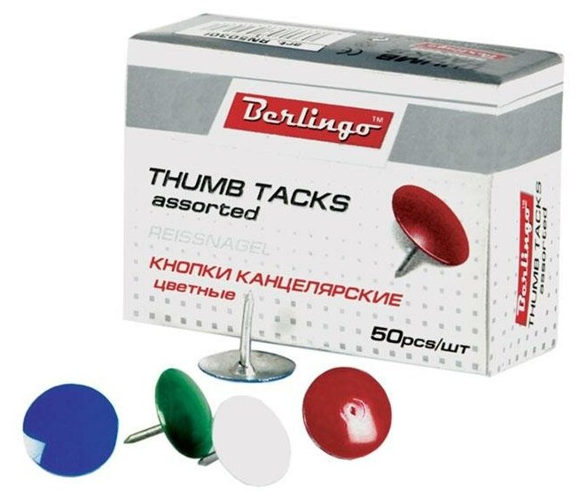 На сегодняшний день товар «Кнопки канцелярские Berlingo гвоздики цветные 10 мм 50 шт картонная коробка (RN5030f)» можно купить с кешбеком в 1 магазине: Арт-маркет "Красный Карандаш"