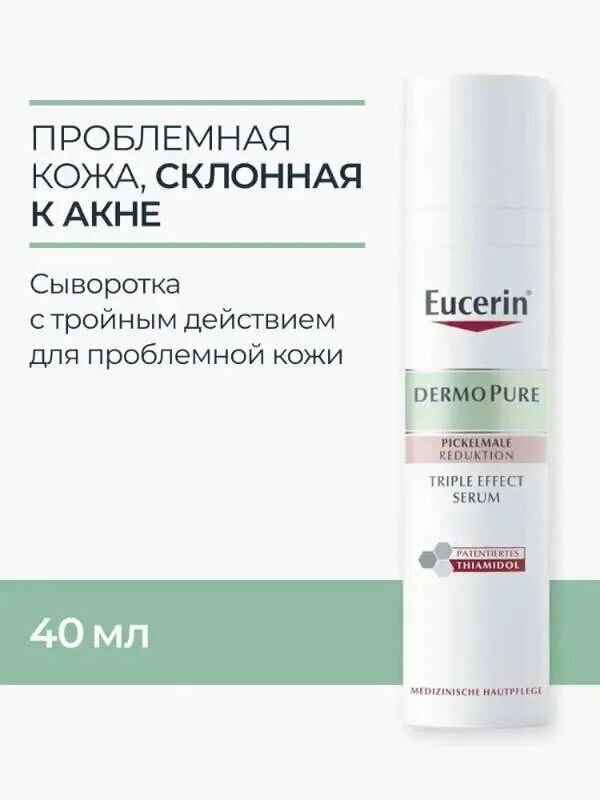 Результат применения: заметно уменьшает несовершенства и пигментацию от акне через 12 недель, а при совместном использовании дважды в день с флюидом для проблемной кожи SPF30 Eucerin DermoPure - помогает поддерживать ровный тон кожи.