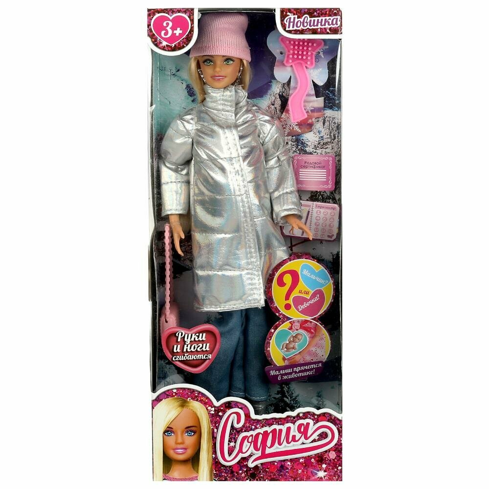 Будущая мама София одета в удобные брюки, блестящее пальто и розовую шапочку. Образ куколки дополняют модные крупные серьги и элегантная сумочка. Одежду и аксессуары легко снять и надеть. С такой модной куклой девочке будет интересно и весело играть: благодаря тому, что руки и ноги куклы подвижны, им можно придать любое положение. У Софии длинные красивые волосы, которые хозяйка куклы сможет заплетать в разные причёски. Детально проработанный дизайн игрушки вдохновит девочку на новые игровые сюжеты.