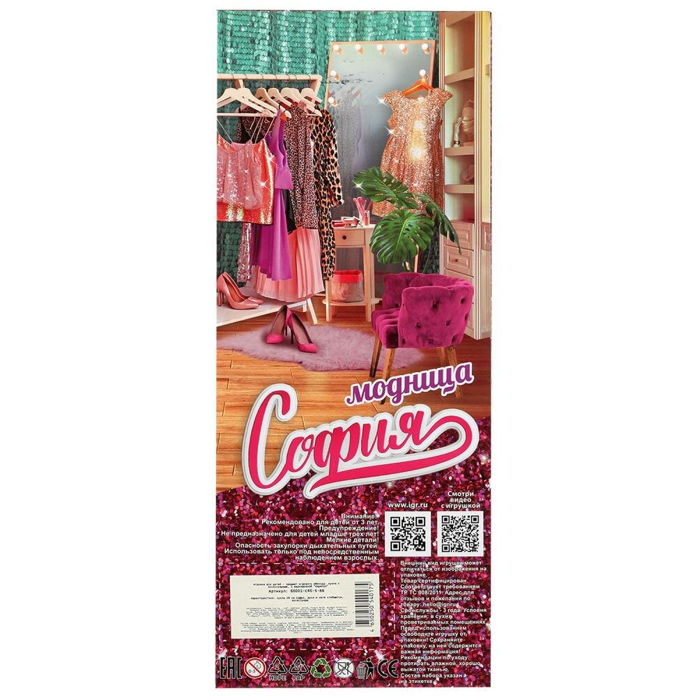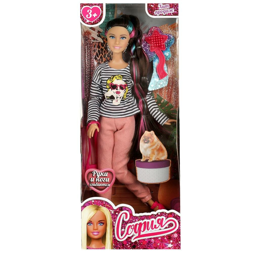 Модница-София одета в полосатую кофту с принтом и розовые брюки. Образ куколки дополняют модные крупные серьги и элегантная сумочка. Одежду и аксессуары легко снять и надеть. С такой модной куклой девочке будет интересно и весело играть: благодаря тому, что руки и ноги куклы подвижны, им можно придать любое положение. У Софии длинные красивые волосы, которые хозяйка куклы сможет заплетать в разные причёски. Детально проработанный дизайн игрушки вдохновит девочку на новые игровые сюжеты.