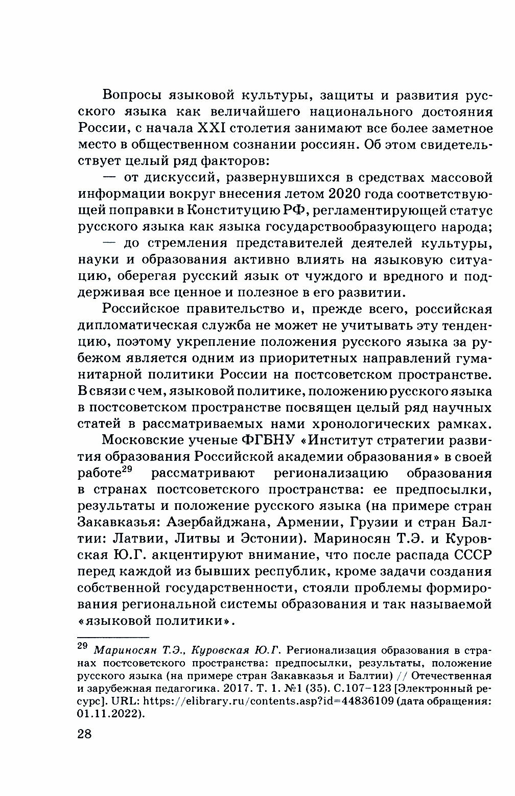 Книга "Правовое положение соотечественников, проживающих в странах постсоветского пространства: сравнительный анализ" содержит результаты исследования, проведенного в Азербайджане, Армении, Беларуси, Грузии, Казахстане, Киргизии, Латвии, Литве, Молдове, Приднестровской Молдавской Республике, Таджикистане, Узбекистане, Эстонии, ЛНР и ДНР. Исследование выполнено Институтом диаспоры и интеграции (Институтом стран СНГ) в 2021-2022 годах. Оно включило в себя анализ нормативно-правовых актов, регламентирующих использование русского языка в исследуемых странах, результатов социологического опроса среди групп населения, относящих себя к российским соотечественникам, обзор ранее проведенных исследований по проблеме использования русского языка и его функционирования в различных сферах общественной жизни.