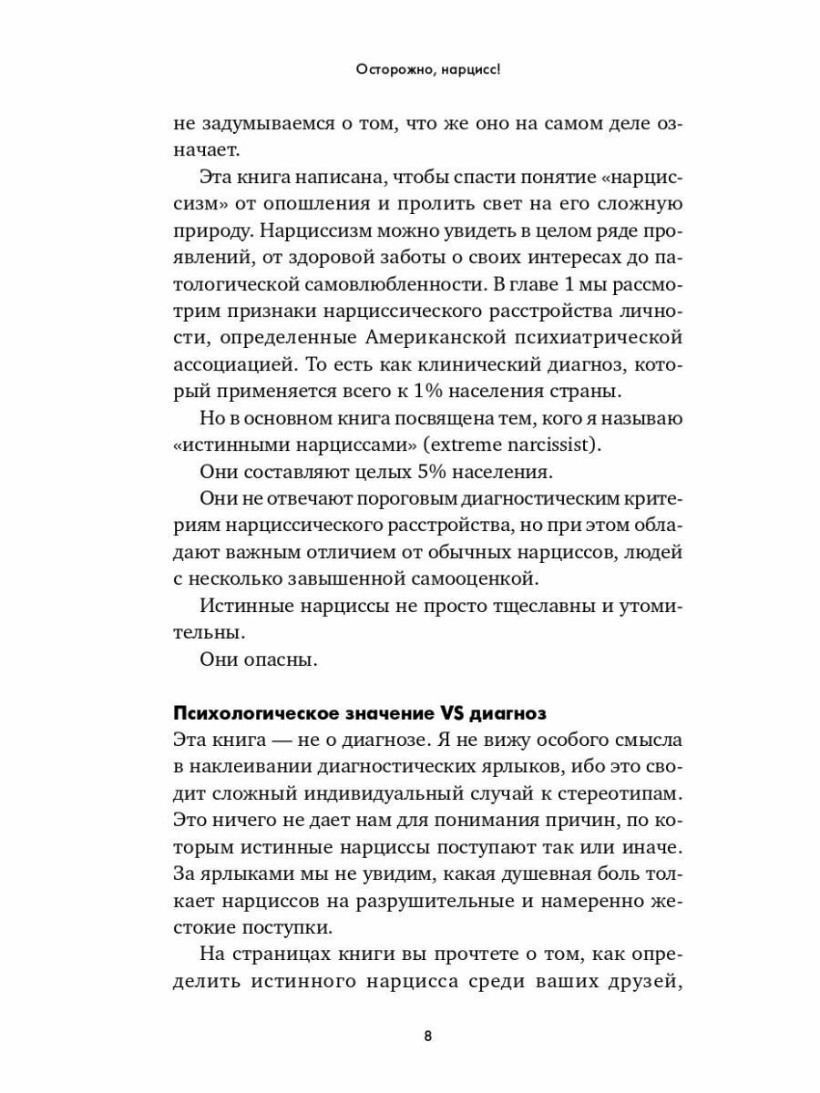 Небольшая книжка, посвящённая нарциссам как явлению в нашем обществе. Порадовал ненавязчивый подход автора и удобная классификация. В книге доступным и понятным языком рассказывается, что это за расстройство и как с этим жить, если в вашей жизни появился (или был) самовлюблённый эгоист. В целом же книга не строго научная, поэтому читать будет интересно всем