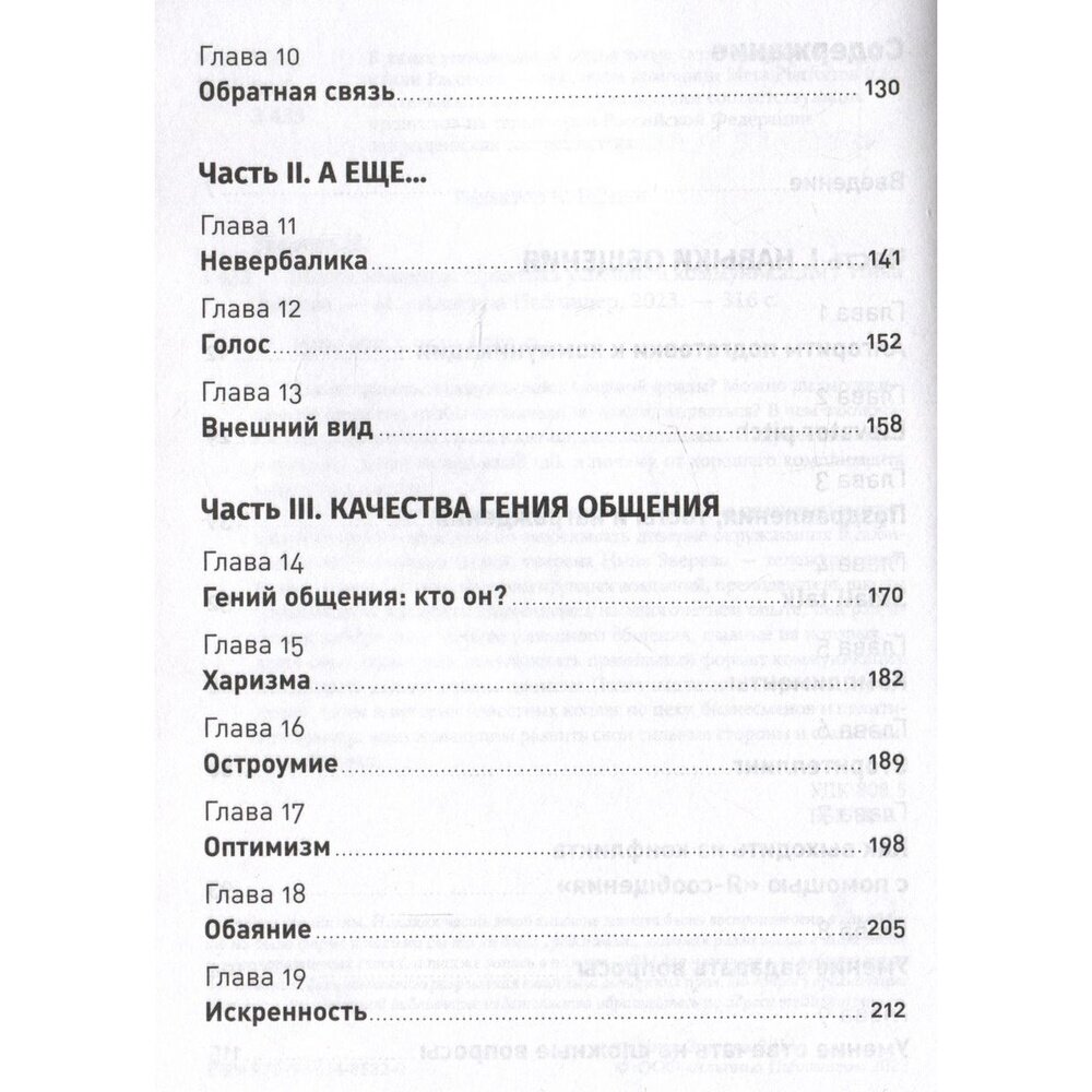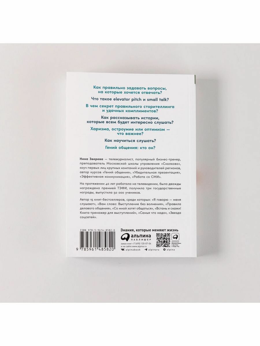 Общение должно приносить радость, а с помощью правильно выстроенной коммуникации можно завоевывать доверие окружающих и добиваться поставленных целей, уверена Нина Зверева — тележурналист, бизнес- тренер, коуч первых лиц крупных компаний, преподаватель школы управления «Сколково». Основываясь на многолетнем опыте, она разработала действенные методы успешного общения, главные из которых — знать свою аудиторию, использовать правильный формат коммуникации и подбирать для нее нужный момент. Понятные техники, простые упражнения, тесты и истории известных коллег по цеху, бизнесменов и политиков помогут всем желающим развить свои сильные стороны и стать гениями общения.