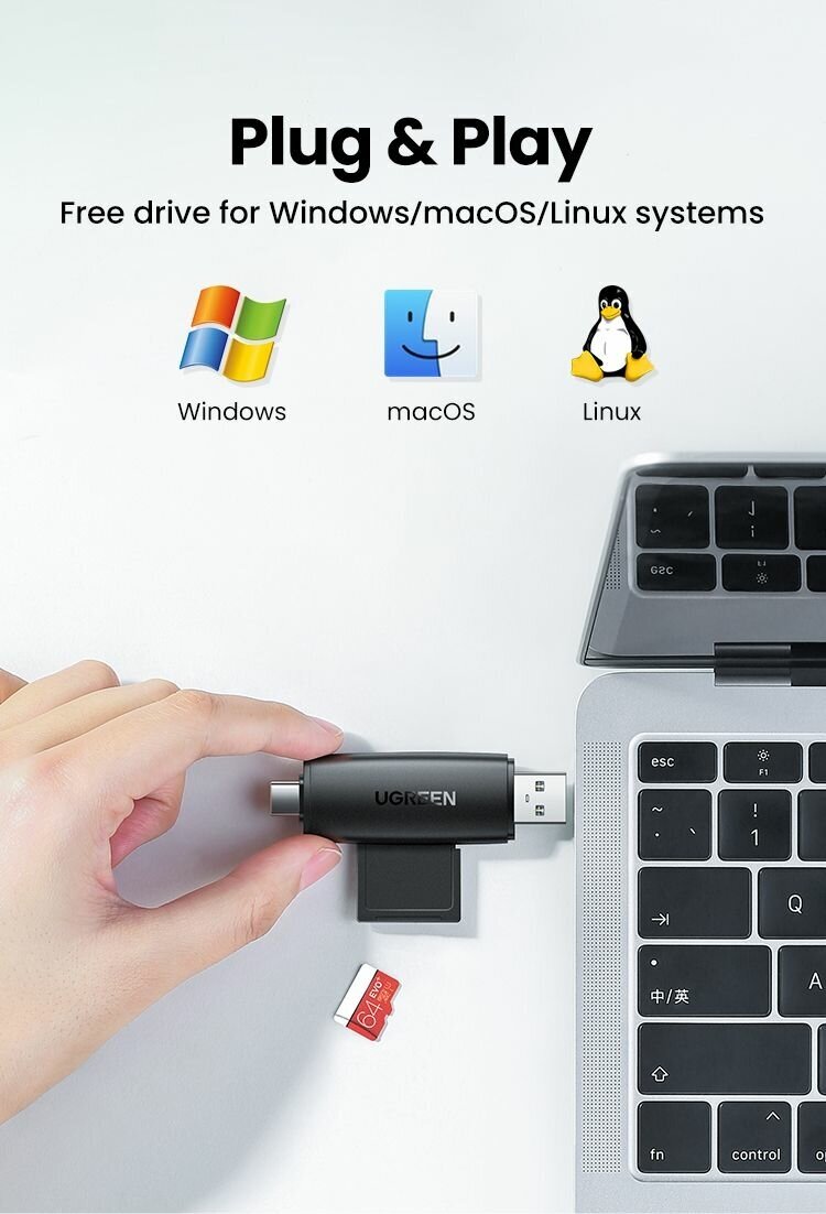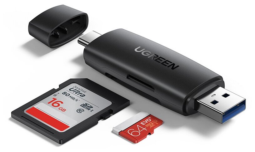 Карт-ридер UGREEN 80191 многофункциональный USB-C+USB TF/SD 3.0 черный CM304