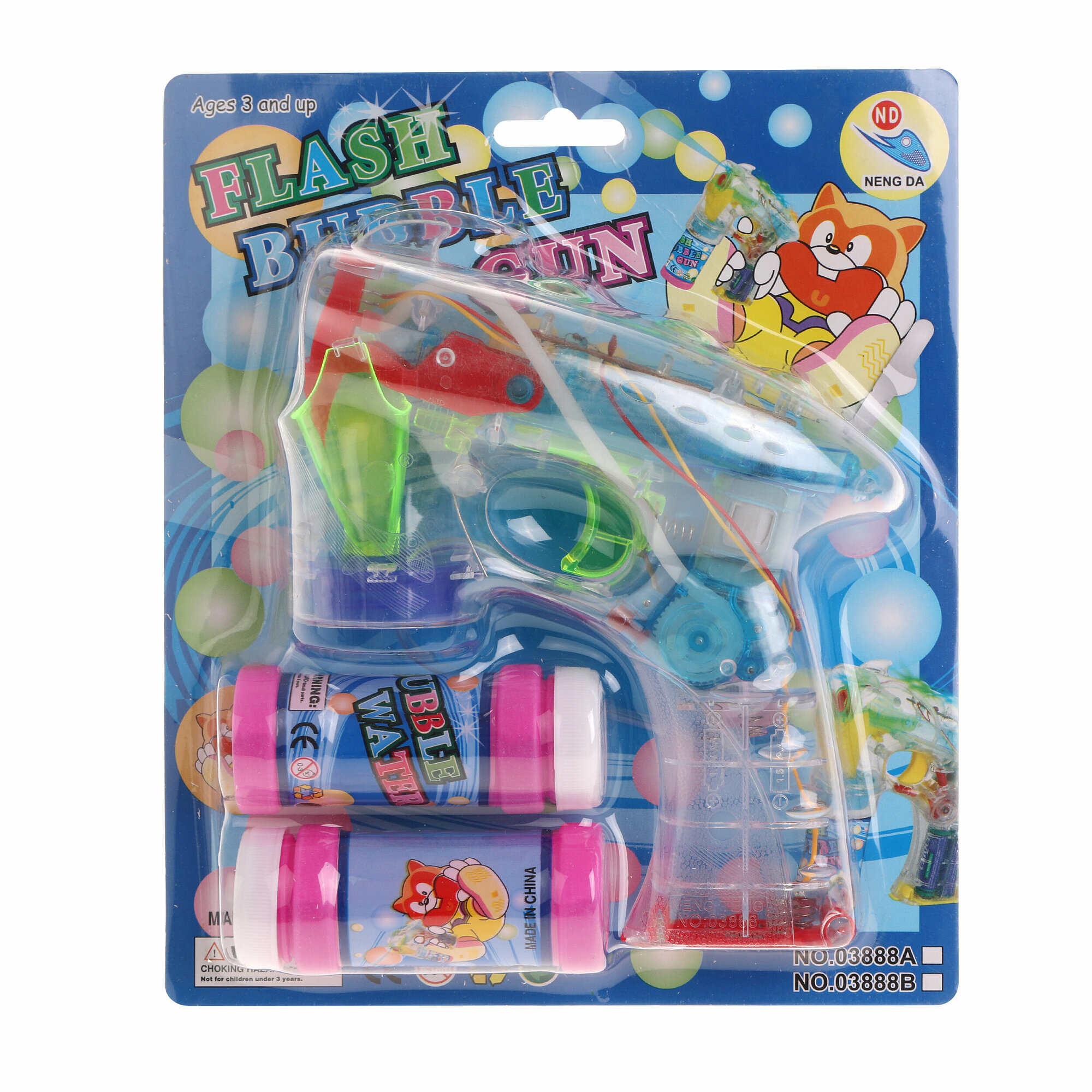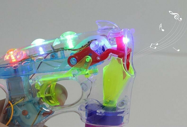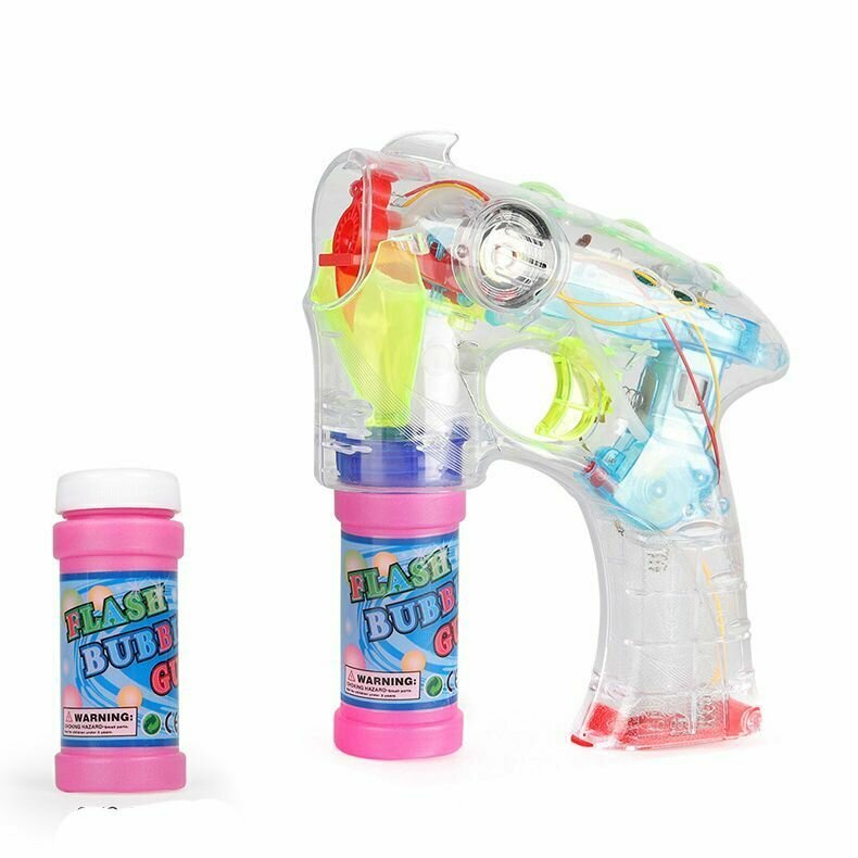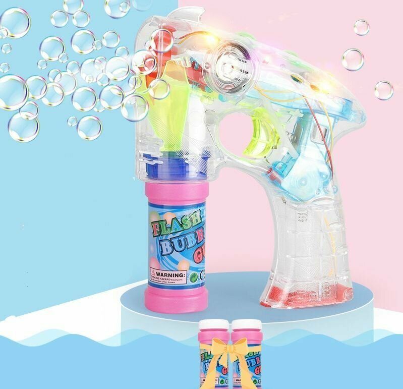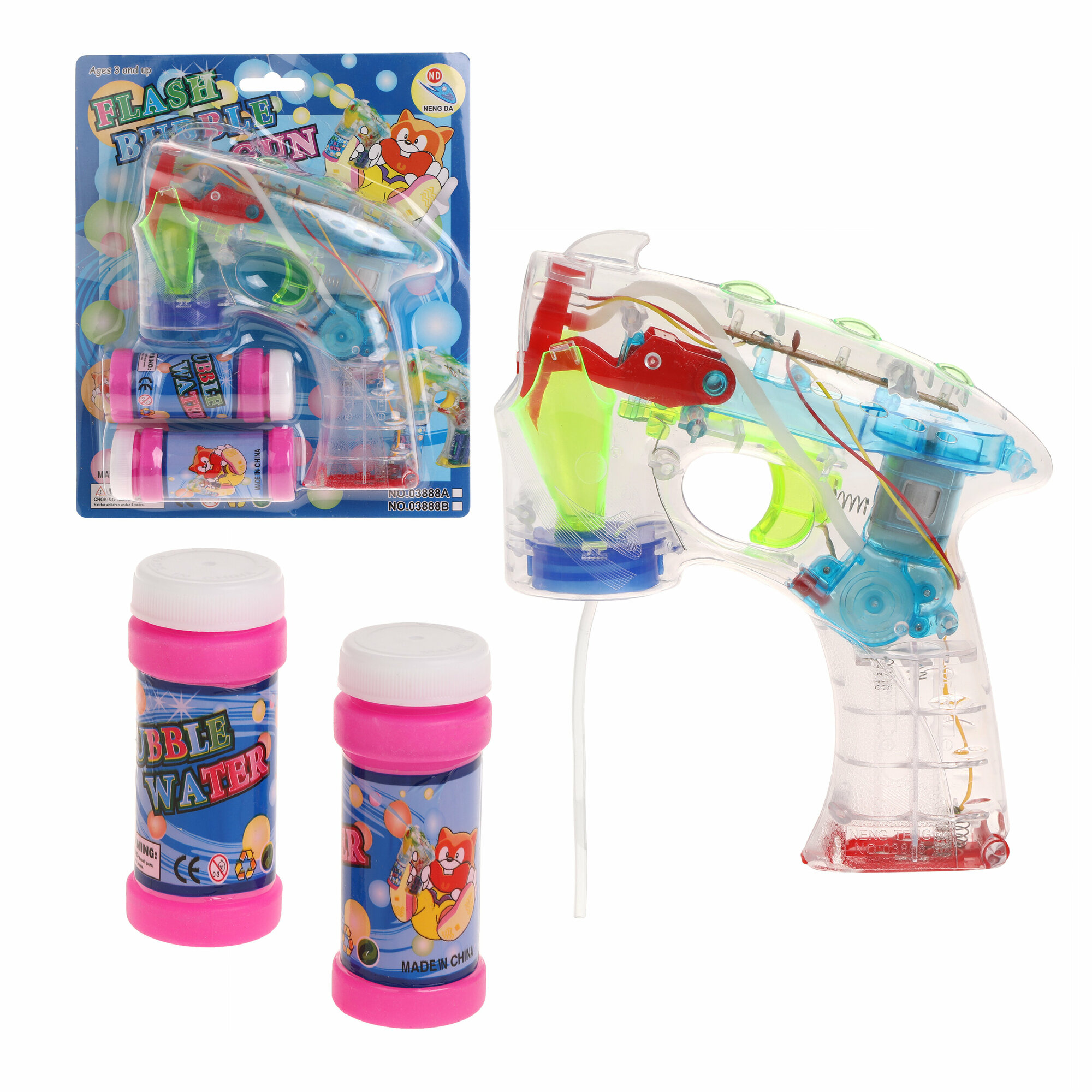 Игровой набор включает бластер для выпускания мыльных пузырей с красивой подсветкой и 2 флакончика с мыльным раствором. Баночка с раствором вкручивается в переднюю часть игрушки. Для выпускания пузырей необходимо нажать на кнопку.