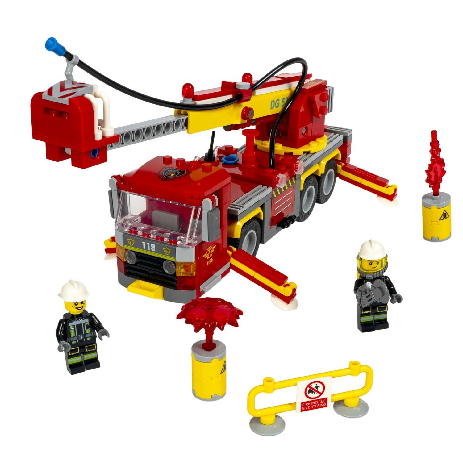 Используя инструкцию, соберите 2 фигурки человечков в форме и пожарную автовышку. В машинке множество подвижных деталей - выдвигается и крутится башня, откидываются упорные стойки. Но главное, налейте воду в резервуар. Нажмите на помпу и из пожарного шланга польется вода. Соберите аксессуары - предупредительные ограждения, горящие бочки из-под бензина, отдельные костры.