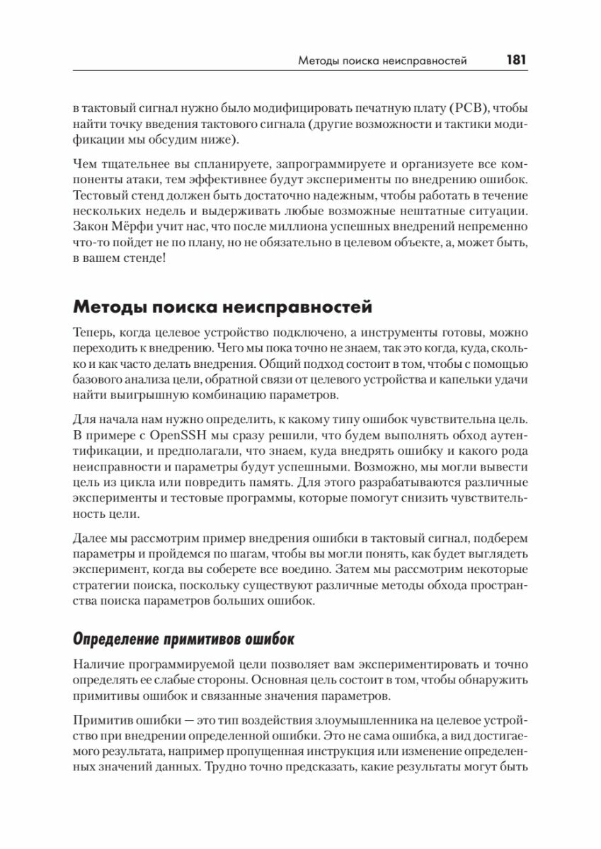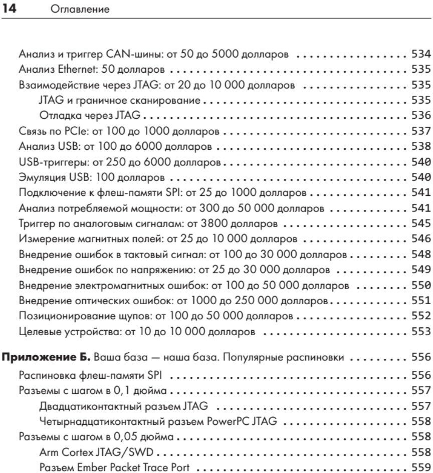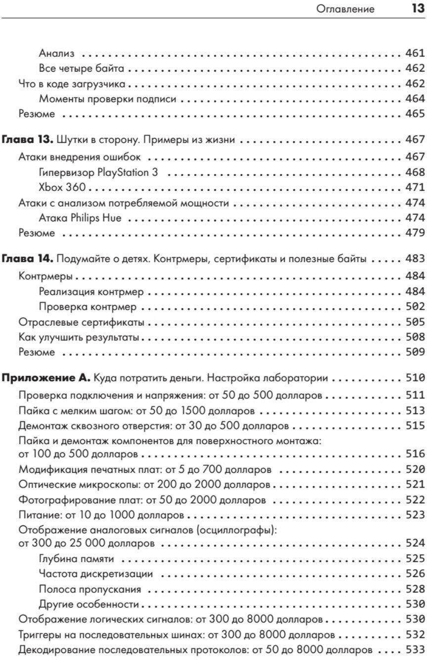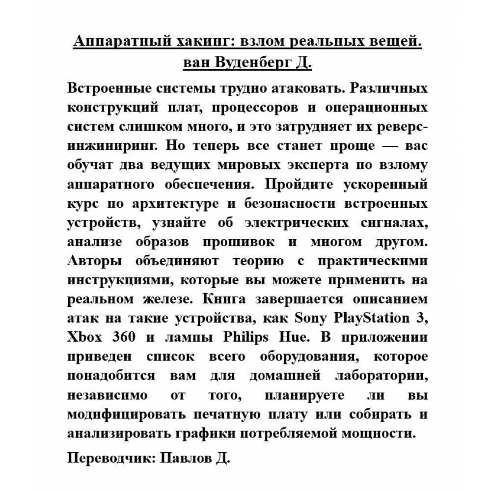 Пройдите ускоренный курс по архитектуре и безопасности встроенных устройств, узнайте об электрических сигналах, анализе образов прошивок и многом другом. Авторы объединяют теорию с практическими инструкциями, которые вы можете применить на реальном железе. Книга завершается описанием атак на такие устройства, как Sony PlayStation 3, Xbox 360 и лампы Philips Hue. В приложении приведен список всего оборудования, которое понадобится вам для домашней лаборатории, независимо от того, планируете ли вы модифицировать печатную плату или собирать и анализировать графики потребляемой мощности.