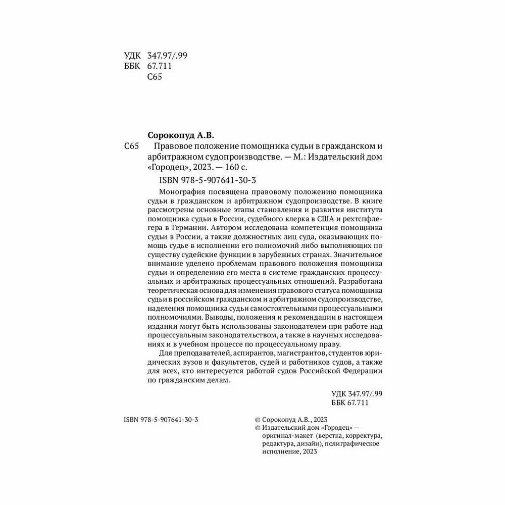 Сервис сравнения цен СкидкаГИД предлагает сравнить цены на товар «Книга: Правовое положение помощника судьи в гражданском и арбитражном судопроизводстве (А. В. Сорокопуд); Издательский дом «Городец», 2023»