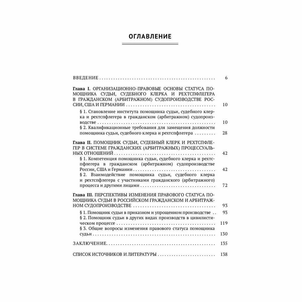 Монография посвящена правовому положению помощника судьи в гражданском и арбитражном судопроизводстве. В книге рассмотрены основные этапы становления и развития института помощника судьи в России, судебного клерка в США и рехтспфлегера в Германии.