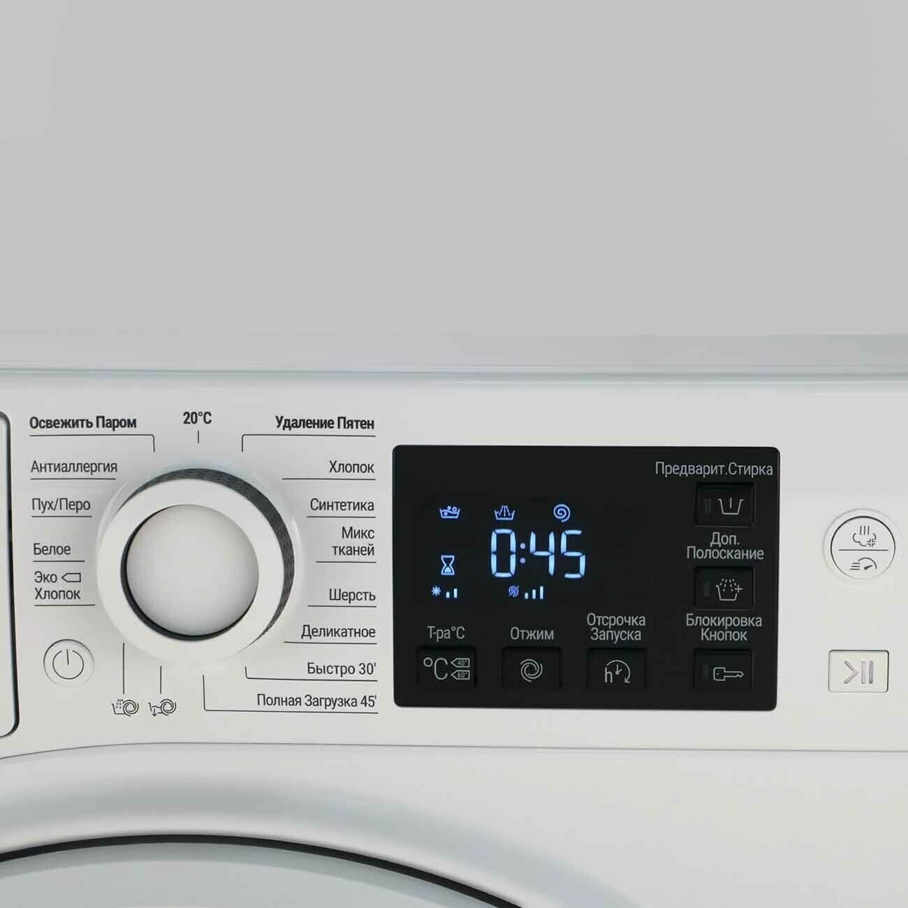 | Программы | освежить паром, 20°c, удаление пятен, полная загрузка 45', хлопок, хлопок эко, синтетика, микс тканей, шерсть, деликатное, быстро 30’, антиаллергия, пух\перо, белое, отжим и слив, полоскание и отжим |