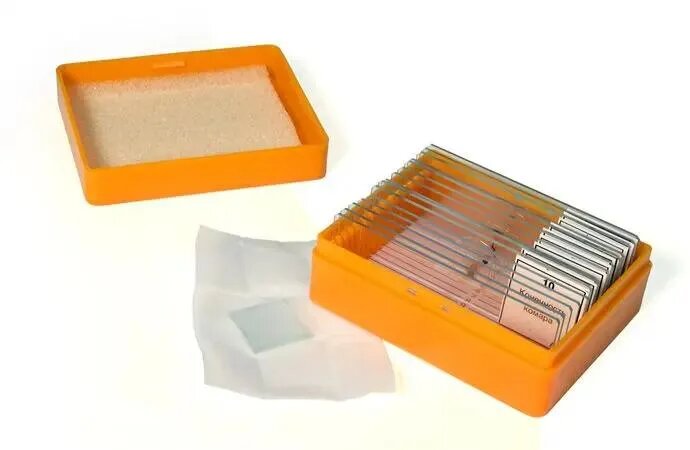 | Особенности | Готовые микропрепараты и чистые стекла можно использовать совместно с микроскопом любой модели. |