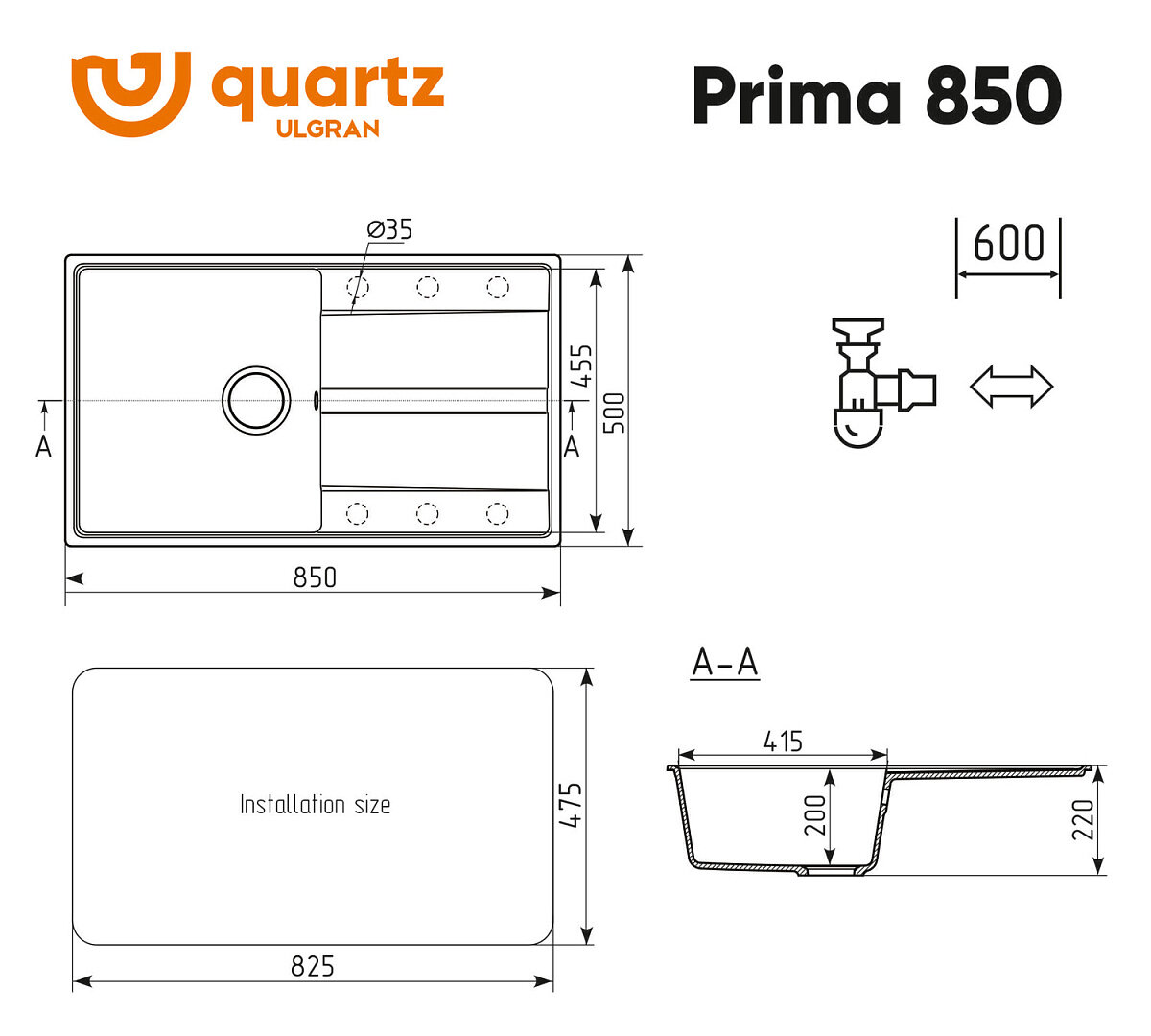 ULGRAN Quartz Prima 850 - функционаяльная односекционная прямоугольная кухонная мойка с просторной чашей и большим крылом, изготовленная на современном автоматизированном оборудовании из высококачественных кварцевых композитов по инжекционной технологии (литье под давлением). Кварцевый композит является поистине инновационным материалом в производстве кухонных моек! Он сочетает в себе такие неоспоримые преимущества как повышенная влагостойкость и термостойкость, возможность придать мойке при изготовлении практичный и функциональный дизайн, увеличенное сопротивление внешнему износу, снижение уровня шума при падении струи воды, безусловная гигиеничность и простота в уходе, а также сравнительно малый вес при высокой прочности. Мойка является реверсивной, то есть оборачиваемой - крыло можно установить как справа, так и слева. Предусмотрено 6 намеченных отверстия под смеситель и аксессуары (дозатор или клапан-автомат). Установка в шкаф шириной от 60 см дает возможность осуществить монтаж мойки практически в любую столешницу и открывает широкий спектр возможностей при проектировании кухни. Данная мойка имеет современный минималистичный дизайн, а наличие эргономичного крыла сделает работу с данной мойкой еще более удобной и комфортной! Можно складывать чистую посуду, вымытые овощи или хранить кухонные аксессуары на дополнительной рабочей поверхности, а специальная форма крыла будет способствовать отведению стекающей воды в чашу мойки, а также защищать столешницу возле мойки от разбрызгивания воды. В комплектацию входит сливная арматура серии "Элит" с гофротрубой, технический паспорт и гарантийный талон. Заводская гарантия составляет 5 лет, а срок службы данной мойки, при соблюдении основных правил ухода за ней, составляет более 20 лет.