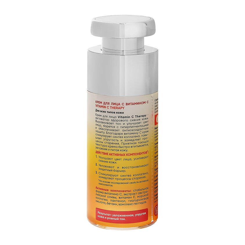 Крем для лица Vitamin C Therapy - активатор сияния для всех типов кожи. Средство выравнивает тон, осветляет пигментацию и улучшает цвет лица. Глубоко увлажняет кожу, стимулирует синтез коллагена, повышает упругость и эластичность. Обеспечивает выраженный антиоксидантный эффект и защищает клетки от окислительного стресса.