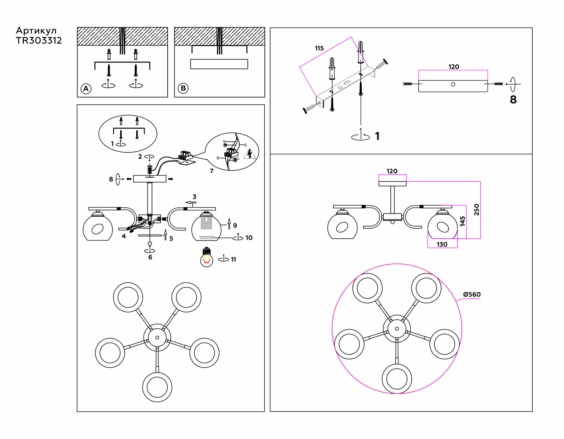 | Номенклатура | TR303312/5 BK/SB/FR черный/бронза/белый матовый E27*5 max 60W D560*250 |