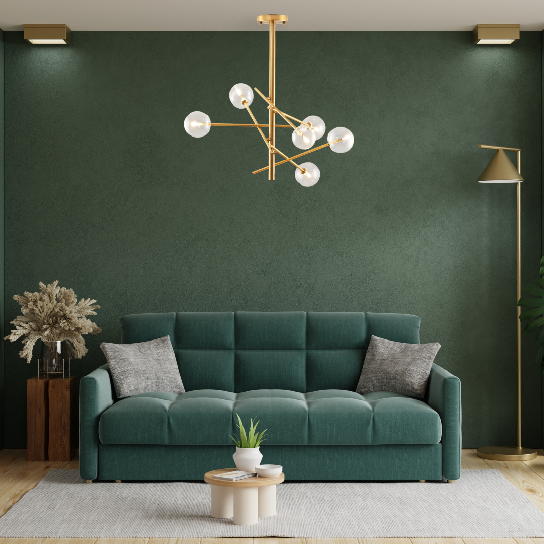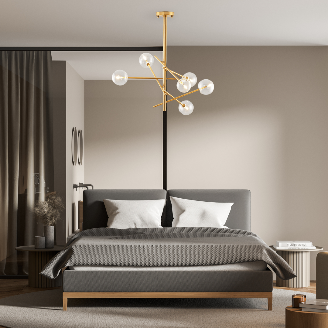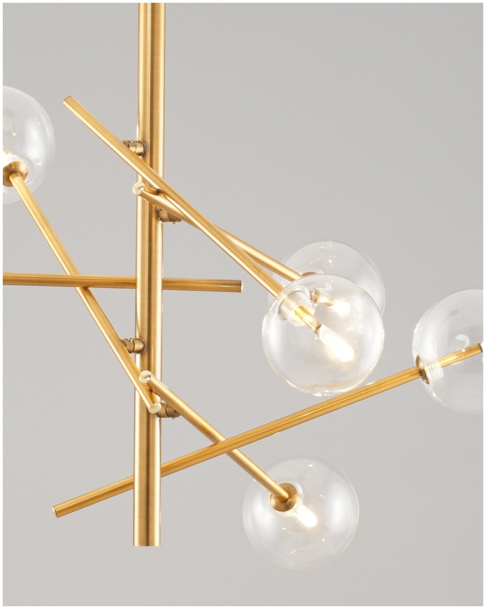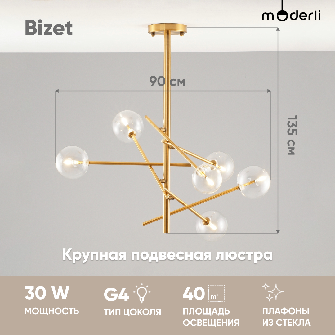 Современная подвесная люстра Bizet. Металлический каркас латунного цвета дополнен плафонами из прозрачного стекла, которые мягко и равномерно рассеивают свет. Для освещения подойдут лампы с цоколем Е14 в количестве 6 штук. Люстра Bizet с диаметром 90 см идеальное решение для зала или обеденной зоны, где необходимо яркое и качественное освещение.