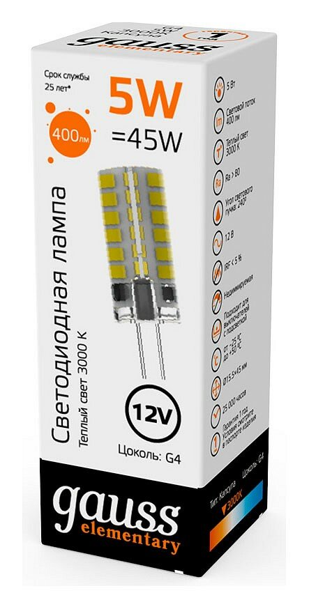 Капсульные лампы GAUSS с цоколем G4 и G9 - отличная замена для стандартных галогенных ламп. Светодиодные лампы GAUSS с цоколем G4 и G9 представляют серию миниатюрных капсульных источников света. Такие лампы отличаются невероятной компактностью и дают чрезвычайно яркое свечение. Капсульные лампы применяются в декоративных люстрах, в специальных и точечных светильниках. Помимо бытового применения, такие лампы могут быть использованы для украшения витрин и вывесок, а также предметов искусства. Благодаря широкому углу свечения в 320 градусов, а также диапазону мощностей от 2 до 5,5 Вт, капсульные лампы смогут заменить галогенные лампы мощностью от 20 до 50 Вт. Световой поток капсульных ламп от 200-500 Лм. Благодаря приятному свету и отсутствию эффекта пульсации, свет капсульных ламп равномерно распределяется и обеспечивает достаточную яркость для освещения даже большого помещения.