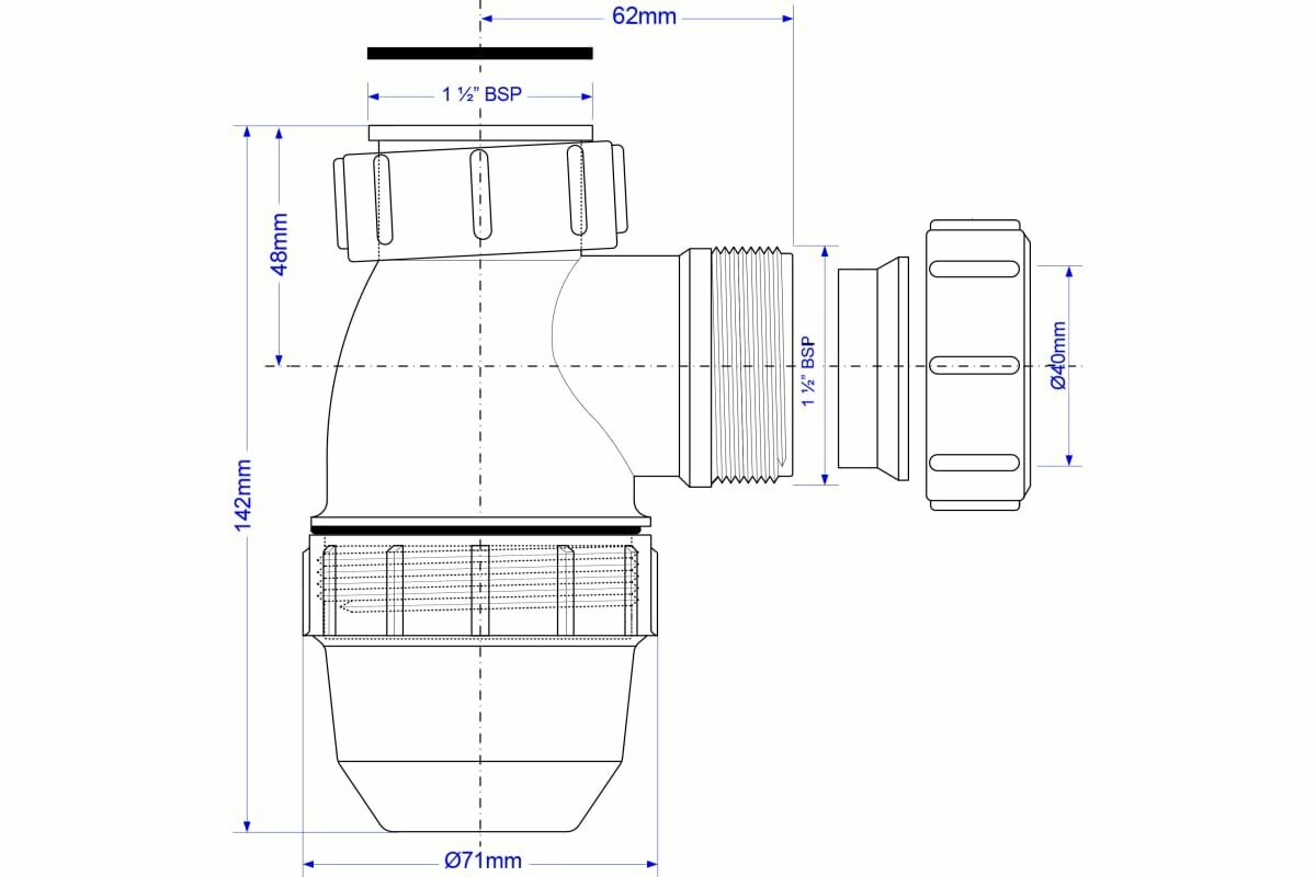 Производитель: McAlpine (Шотландия).Сифон бутылочный для раковины (кухонной мойки).Сифон применяется в случаях, когда раковина уже оборудован выпуском.Отличительной особенностью является маленький размер колбы, что удобно, при отсутствие места, для установки стандартного сифона.Выход у сифона (компрессионный) сделан под отводную трубку, диаметром 40 мм, или гофру с накидной гайкой, диаметром резьбы 40 мм (1 1/2").Высота не регулируется.Удобное, простое и надежное подключение.Характеристики:Диаметр выхода: 40 мм (1 1/2")Высота сифона: 142 мм