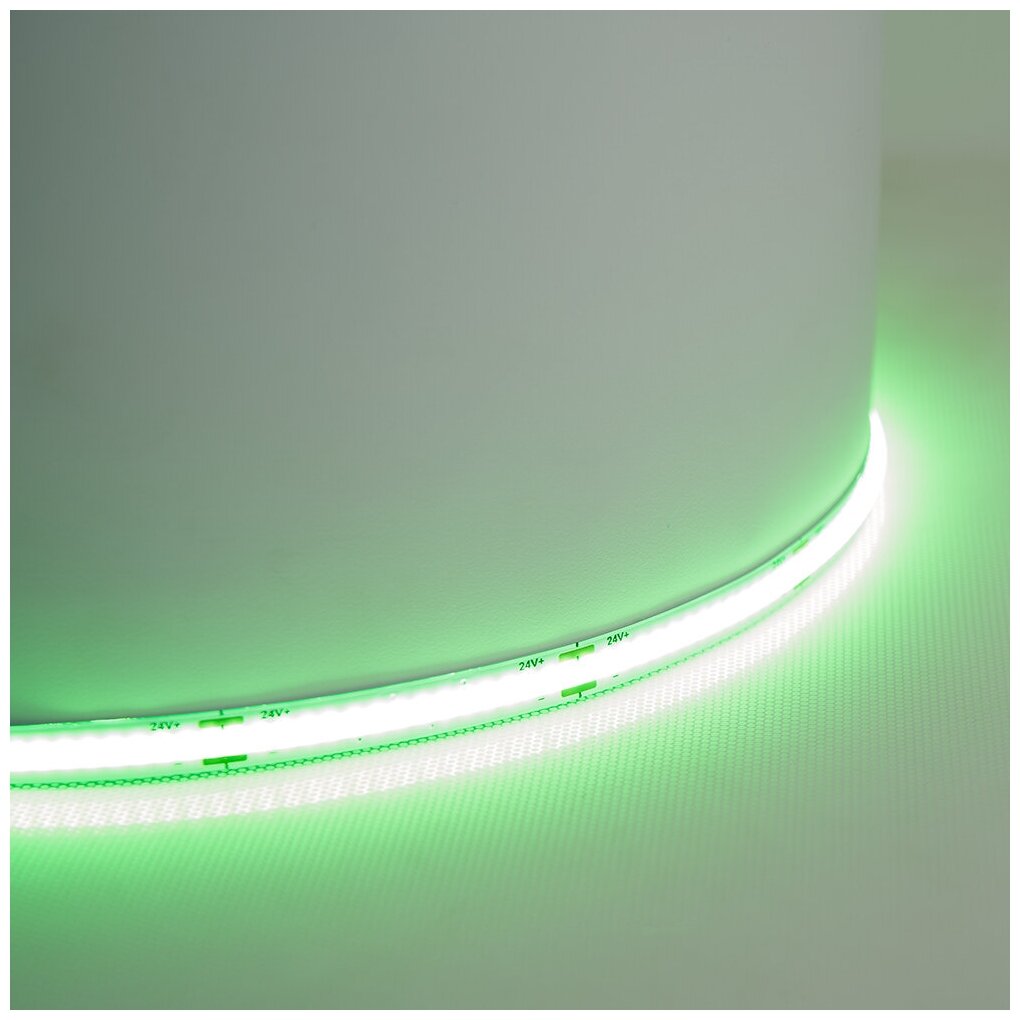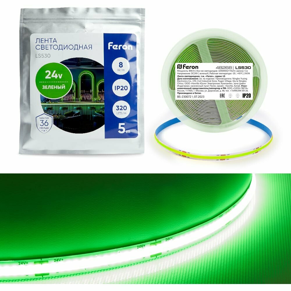 Модели с напряжением 24 вольта обладают большей надежностью, яркостью и удобством подключения при использовании диммеров и контроллеров.Лента светодиодная 24V FERON LS530, 320*COB, 8W/m, IP20, (зеленый), Кратность резки мм 49,7мм, 5000*8*1,80мм