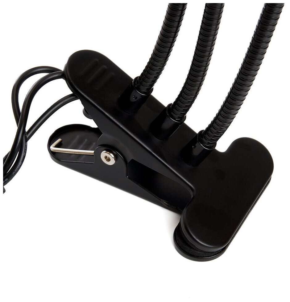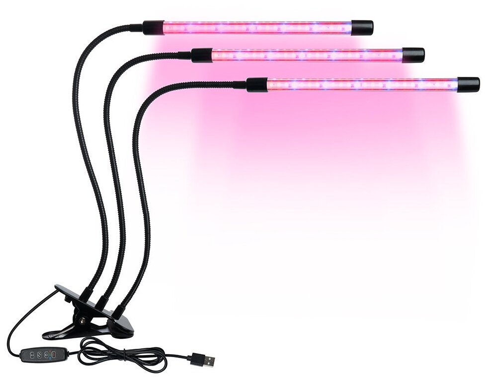 Фитосветильник настольный для растений, для ускорения роста рассады. На прищепке FERON DE7000цвет черный, 6W, DC5ВV, (красно-синий), материал пластик, алюминий, в комплекте кабель с таймером, 110*80*720мм, после выключения фитолампа включается автоматически на следующий день- 10 уровней яркости- 3 режима- гарантия 24 месяцаСиний спектр необходим для вегетативной стадии роста, в целом способствуя укреплению растений. Красный свет необходим растениям для цветения и плодоношения. Красный + синий спектр дополняет недостаток солнечного света, подходит для выращивания рассады в весенне-летний период. Светильники имеют возможность диммирования от 10% до 100% яркости, таймер на 3, 9 и 12 часов работы, а также, 3 режима свечения: красное, синее и смешанное (красное и синее в соотношении мощности оптического излучения 3:1).