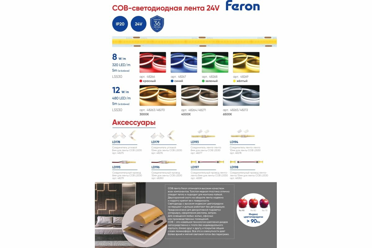 Лента с CRI90 гарантирует точную передачу цветов, идеальна для акцентного освещения.Лента светодиодная 24V FERON LS530 , 480*COB, 12W/m, IP20, 3000К (теплый белый), Кратность резки мм 50мм, 5000*10*1,80мм