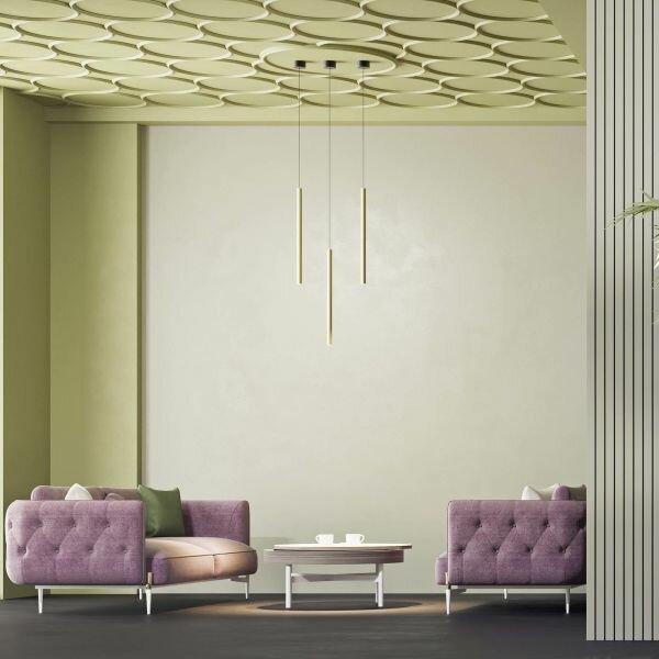 Подвесной светильник. Мощность 9 Вт, св. поток 561 лм, 64 лм/Вт, дневной 4000 K, CRI>90, угол 24°, напряжение питания 230 В. Латунный круглый корпус из алюминия, рассеиватель PC, степень защиты IP20. Размер: диаметр 30 мм, длина 600 мм, размер чаши: диаметр 80 мм, высота 40 мм. Монтаж подвесной, длина подвеса 1500 мм. Драйвер 28-42 В, 200 мА, пульсация